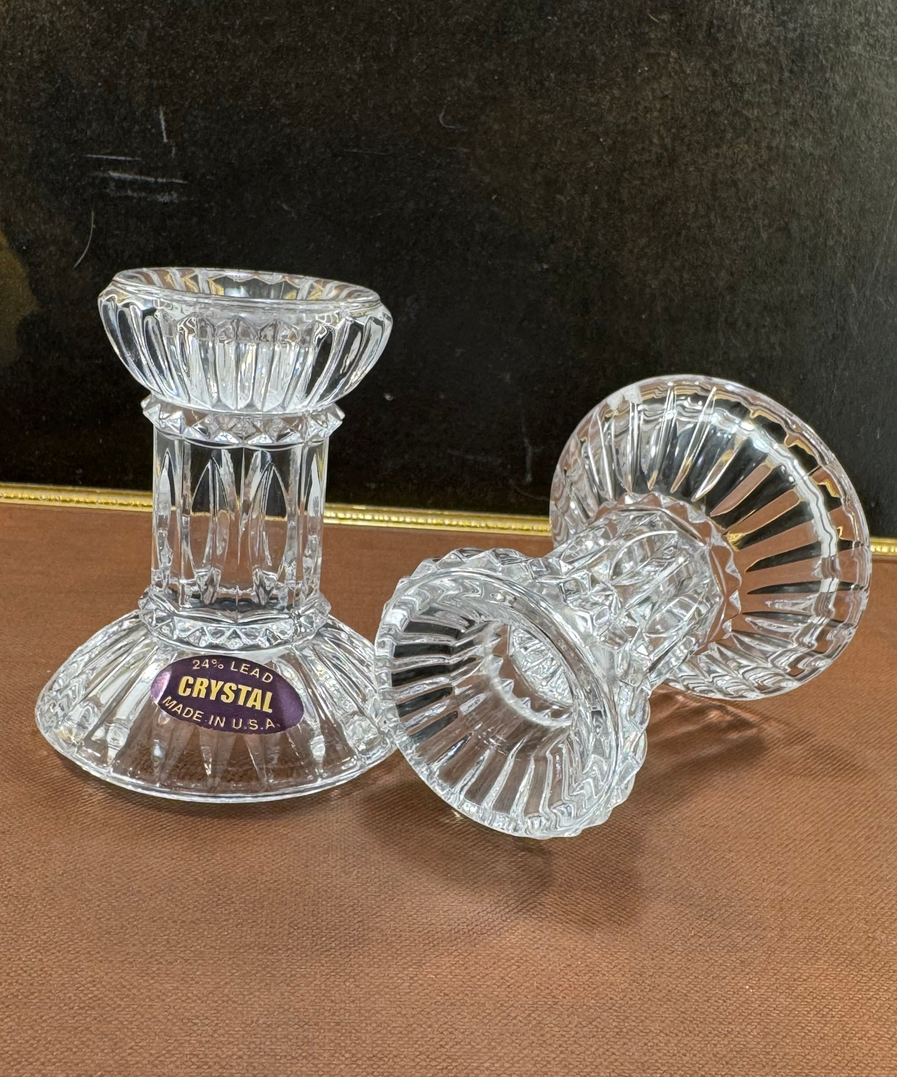 Elegant pair of lead crystal candleholders featuring a beautifully faceted design that catches and reflects the light with every angle. Made in the USA of 24% lead crystal, these petite holders have a timeless appeal and substantial weight for their size.