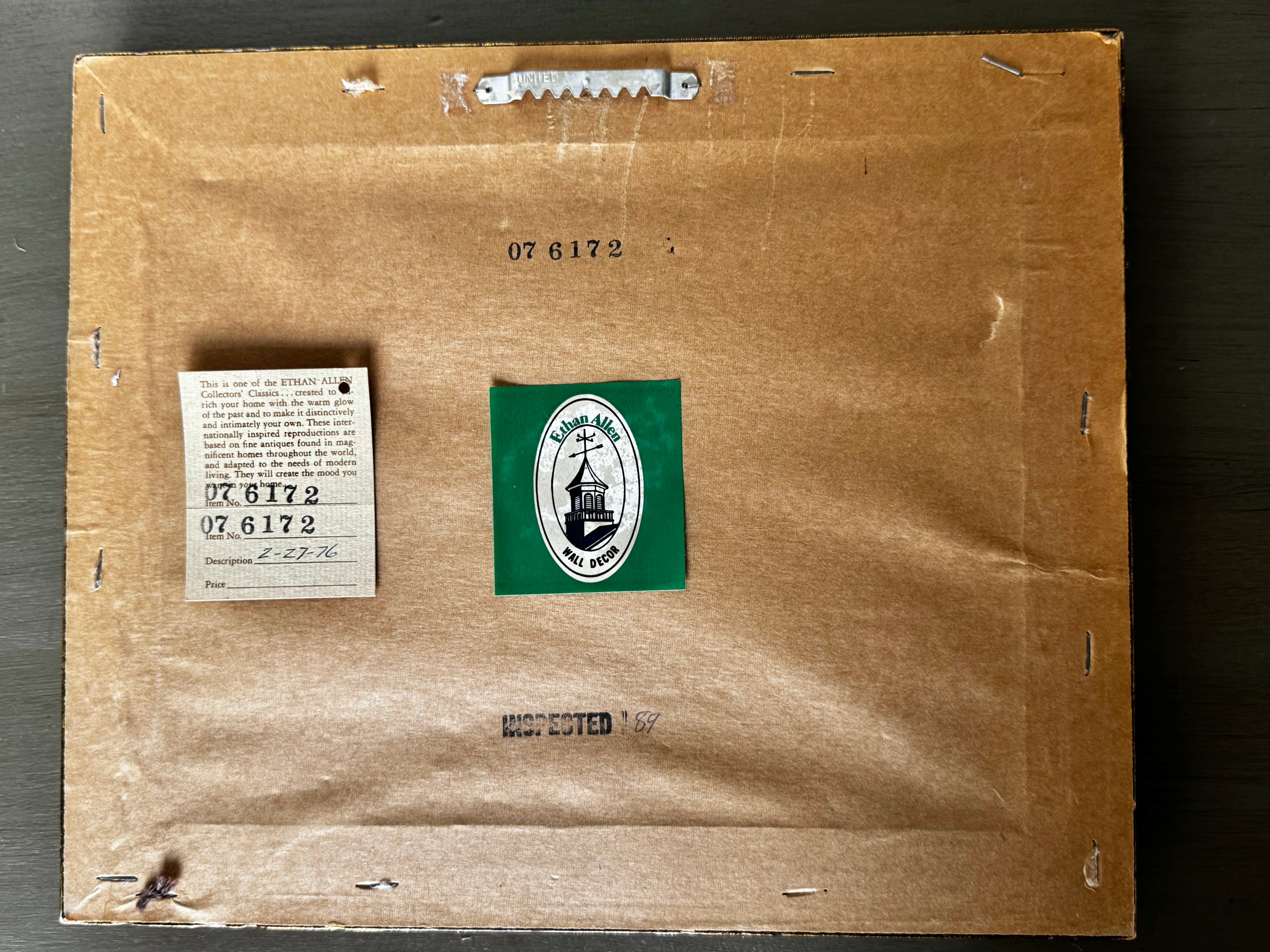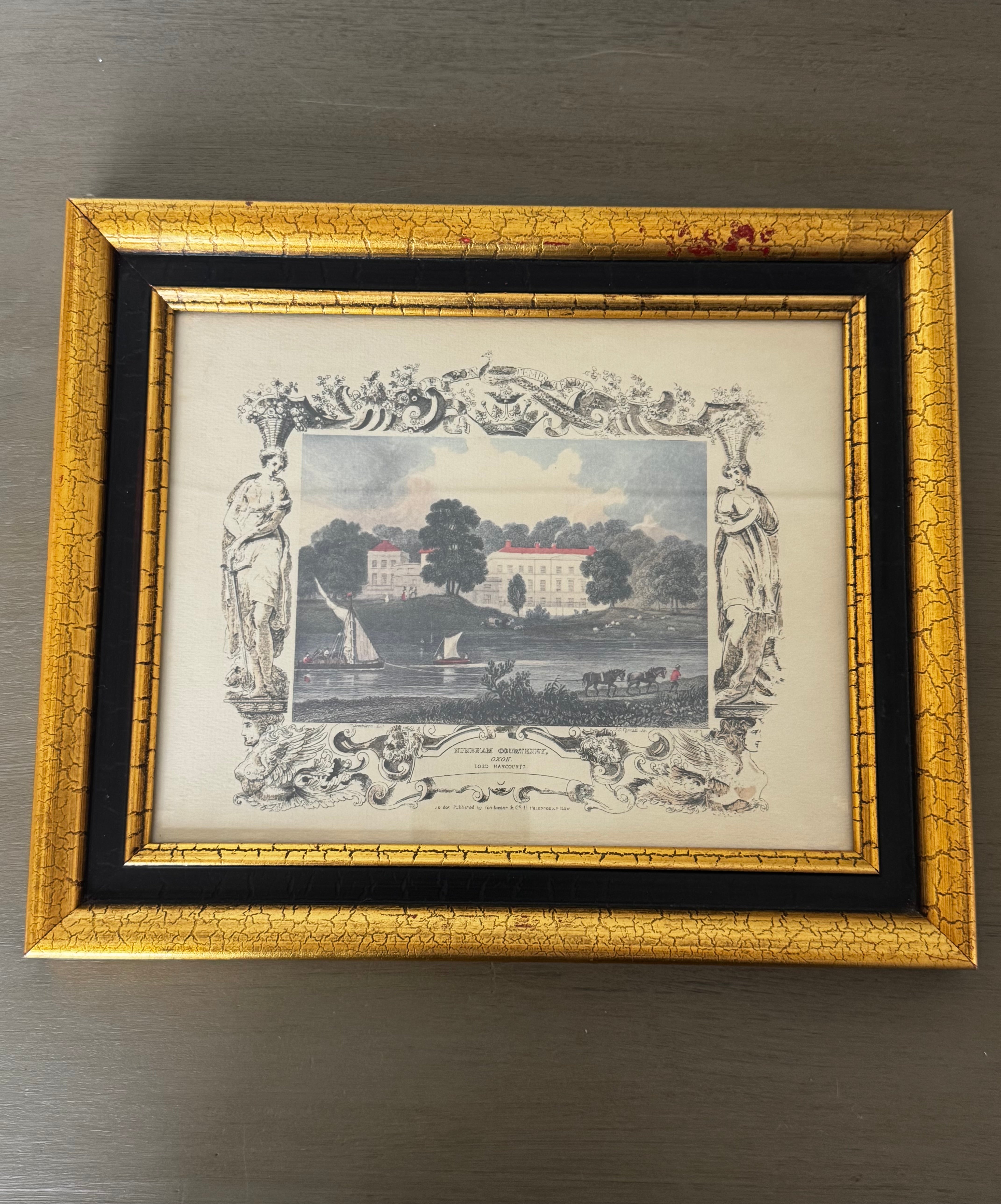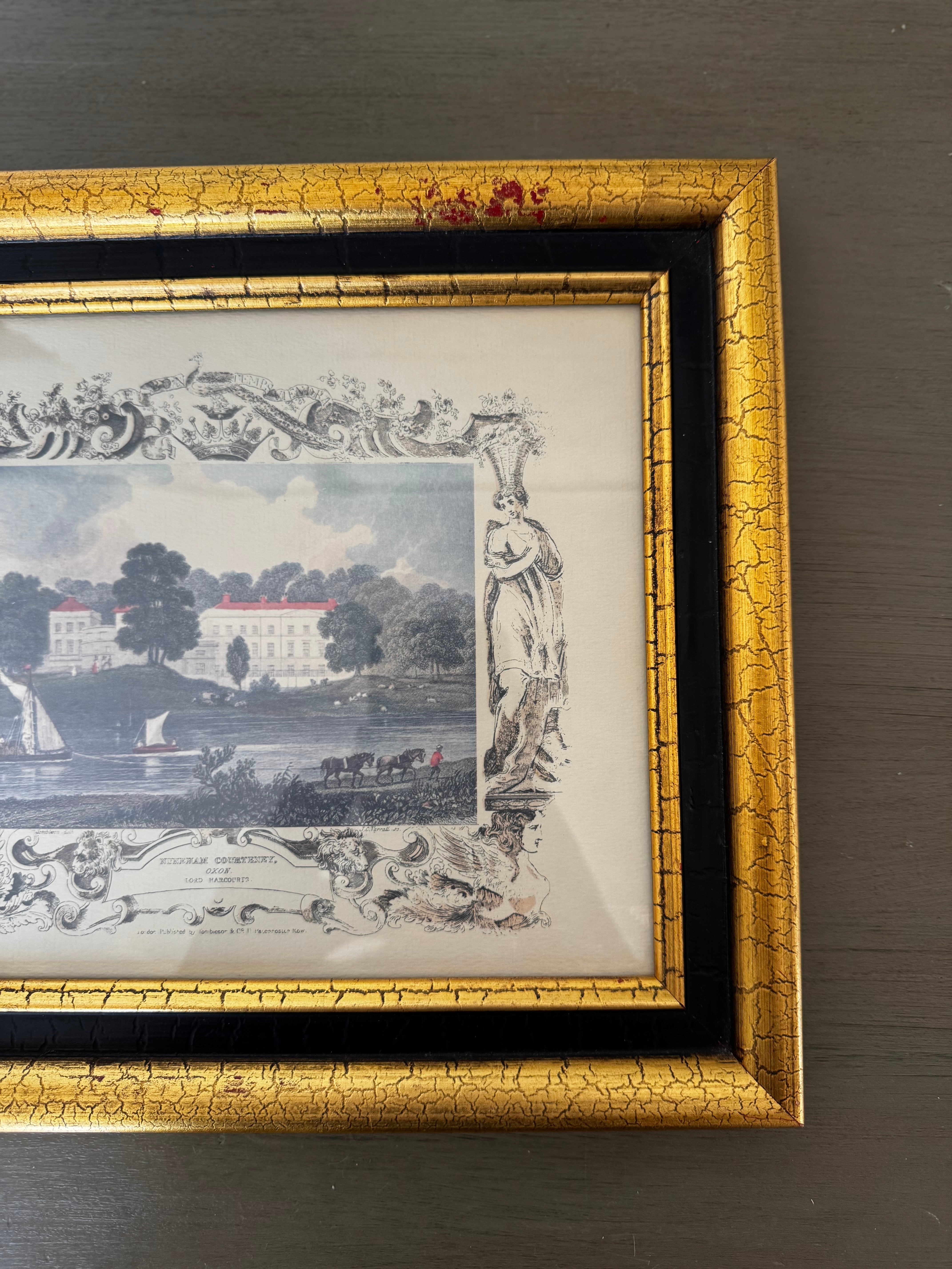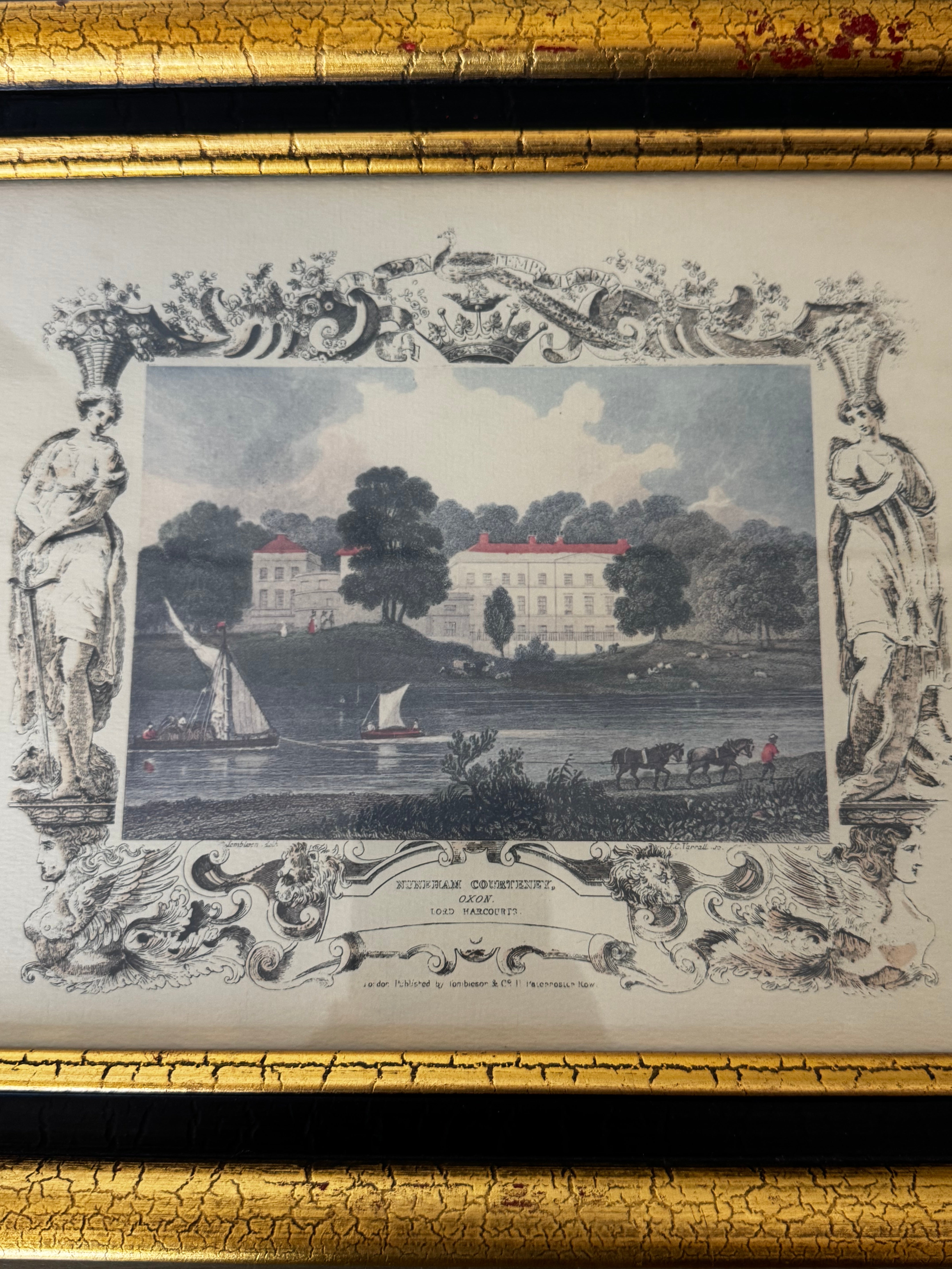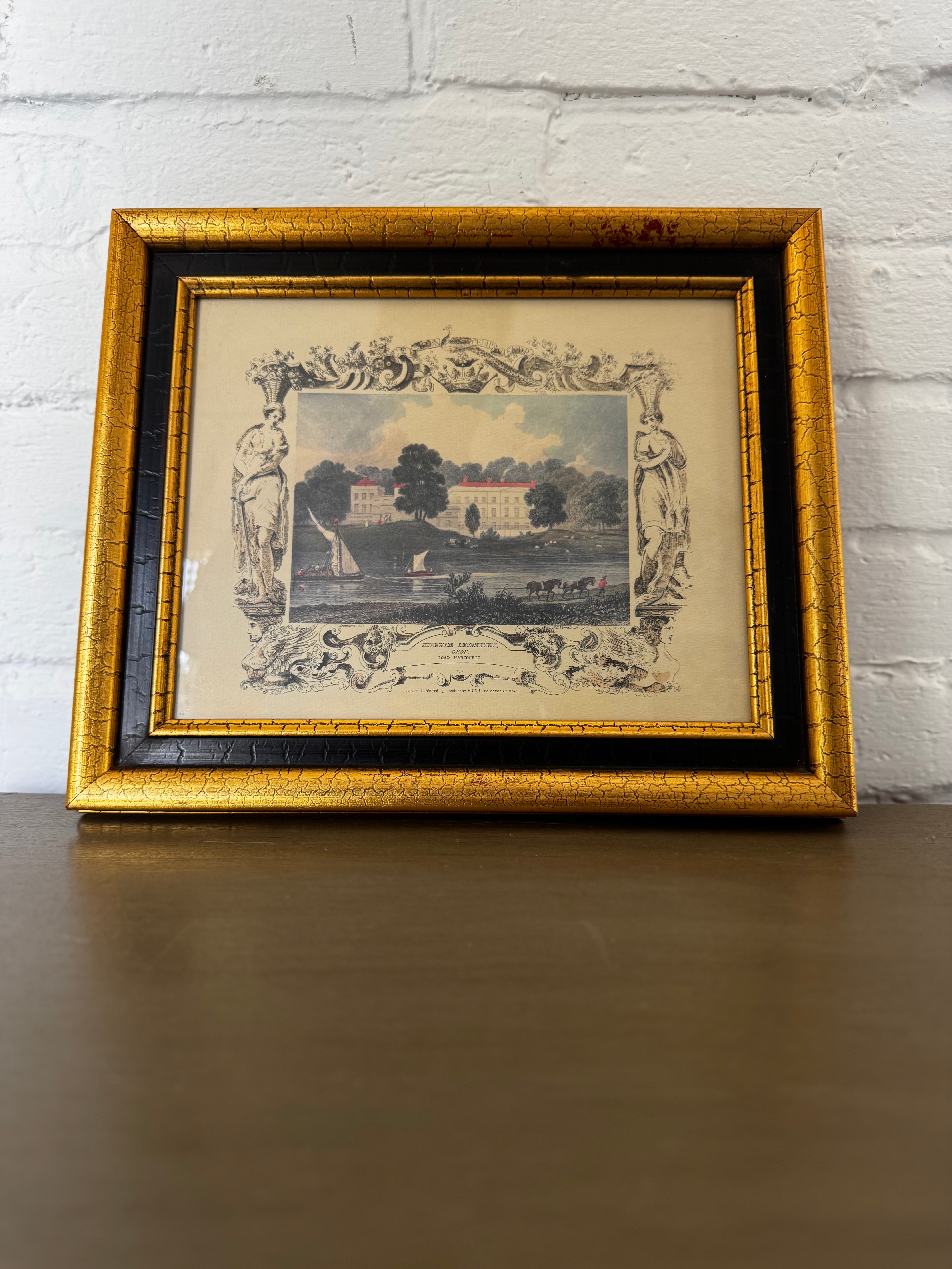 A stately vintage reproduction print featuring Nuneham Courtenay, Oxon – Lord Harcourt. This is part of Ethan Allen’s 1976 Collector’s Classics. Crackled gold and black wood frame with signs of age — including some flaking that reveals charming red undertones.
