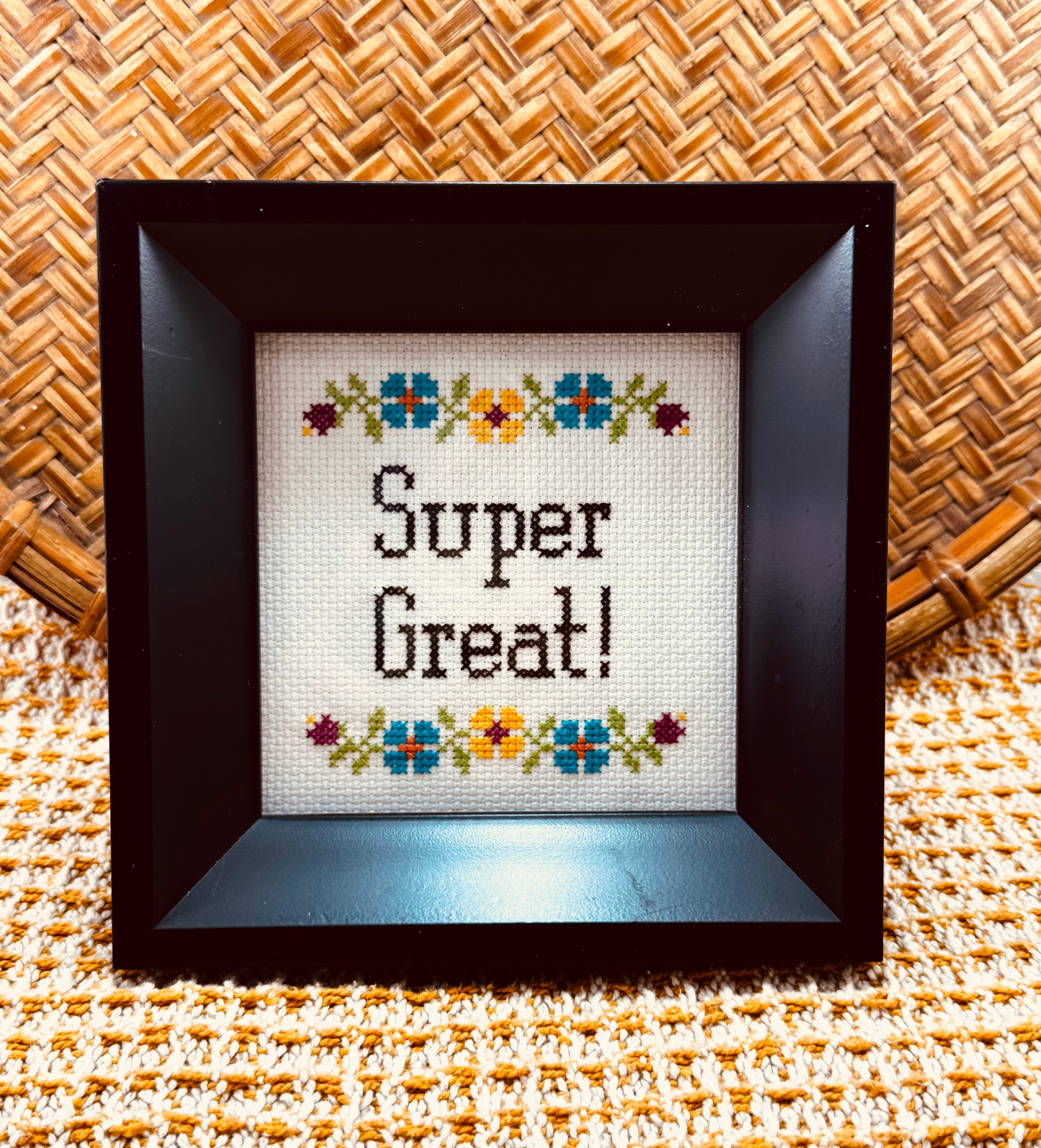 A cheerful 4”x 4” vintage cross-stitch featuring the phrase “Super Great!” framed by colorful folk-style florals. Set in a classic black frame, this piece adds a playful pop of positivity—perfect for a desk, gallery wall, or anywhere that could use a little encouragement and charm.