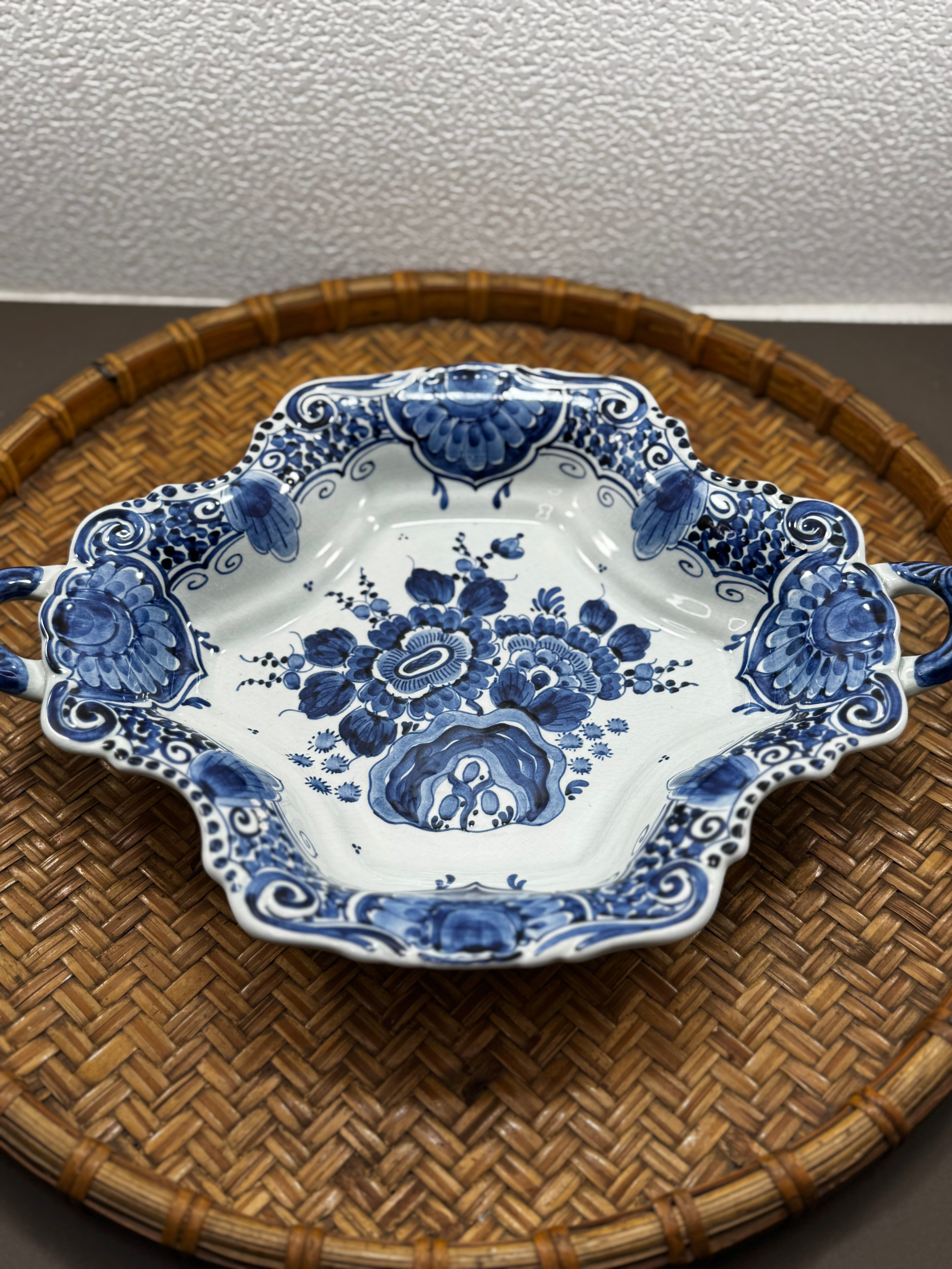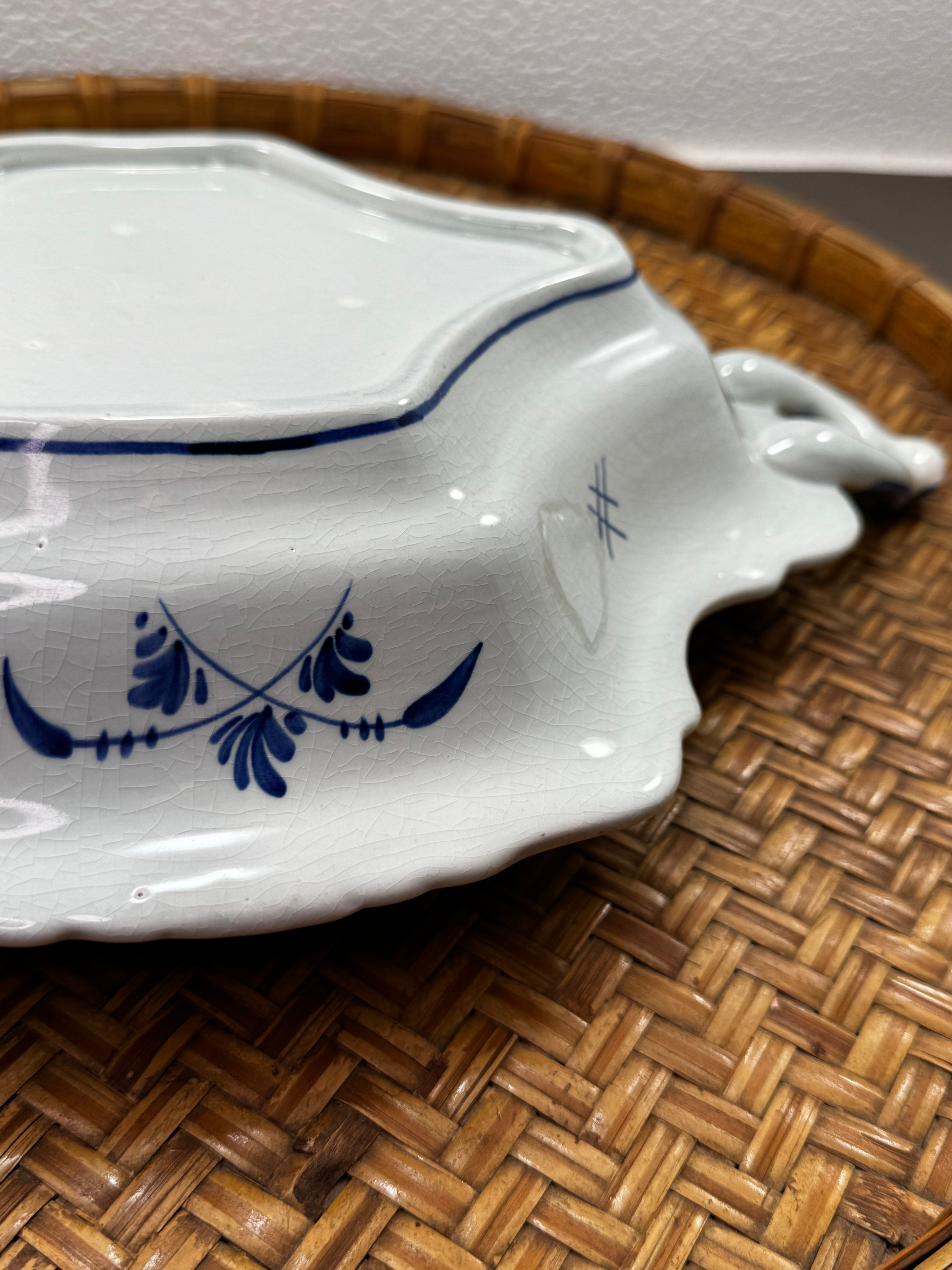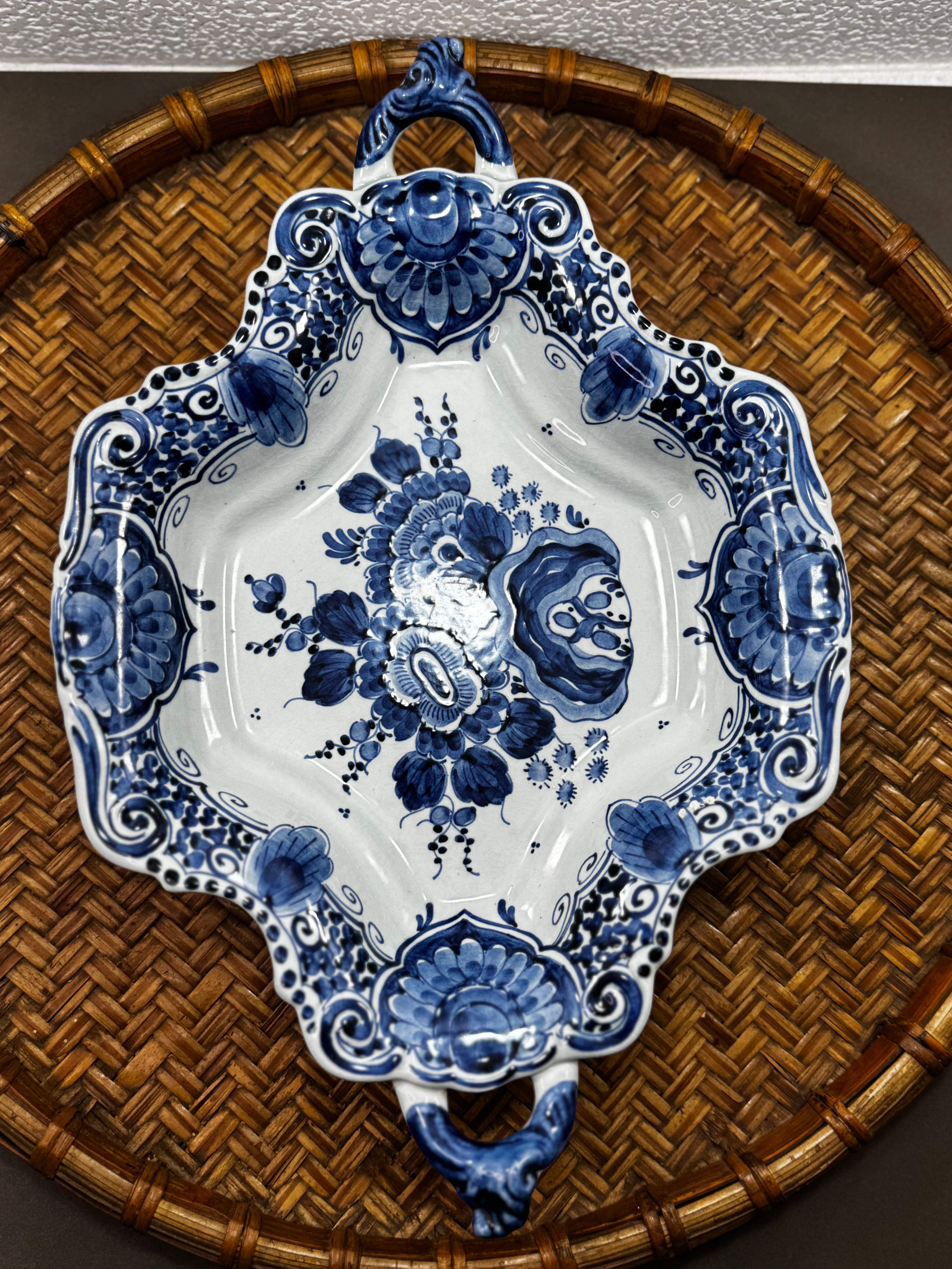 A beautiful piece of hand-painted blue floral Dutch Delftware. Unmarked, measuring 14” x 9.5” x 2” this decorative multi-sided dish with handles would be a a beautiful addition to any table. Good condition, has some crazing.