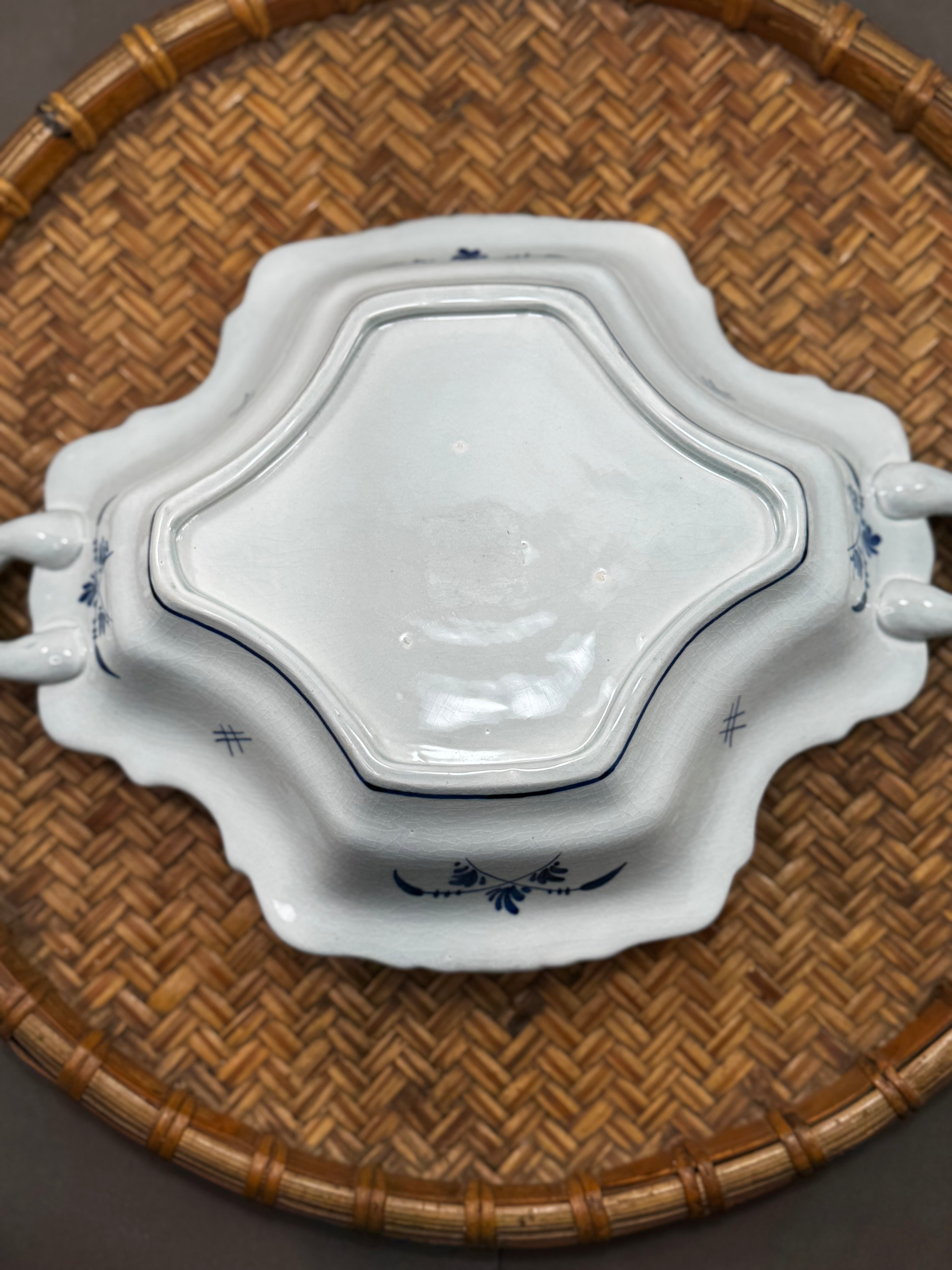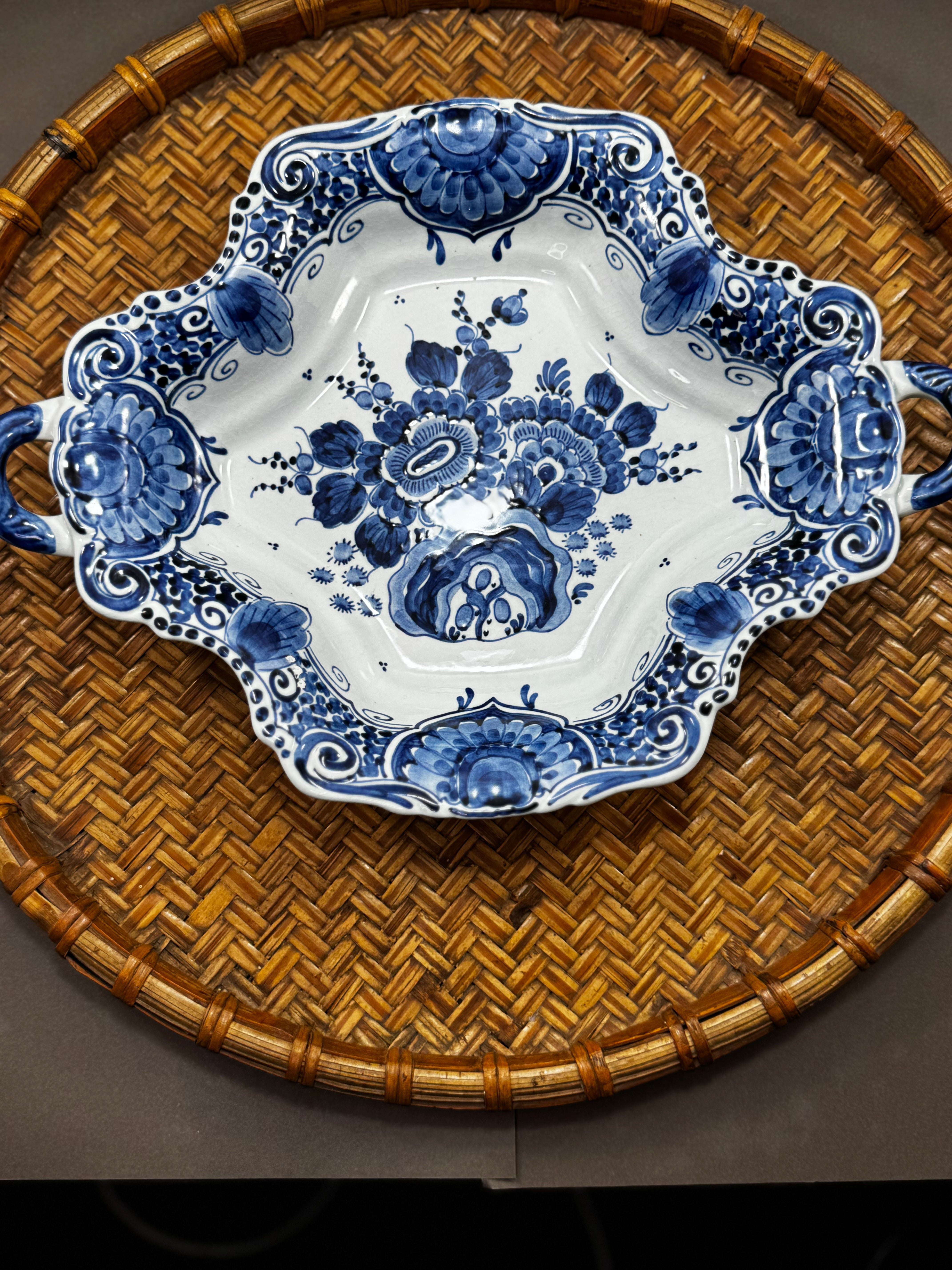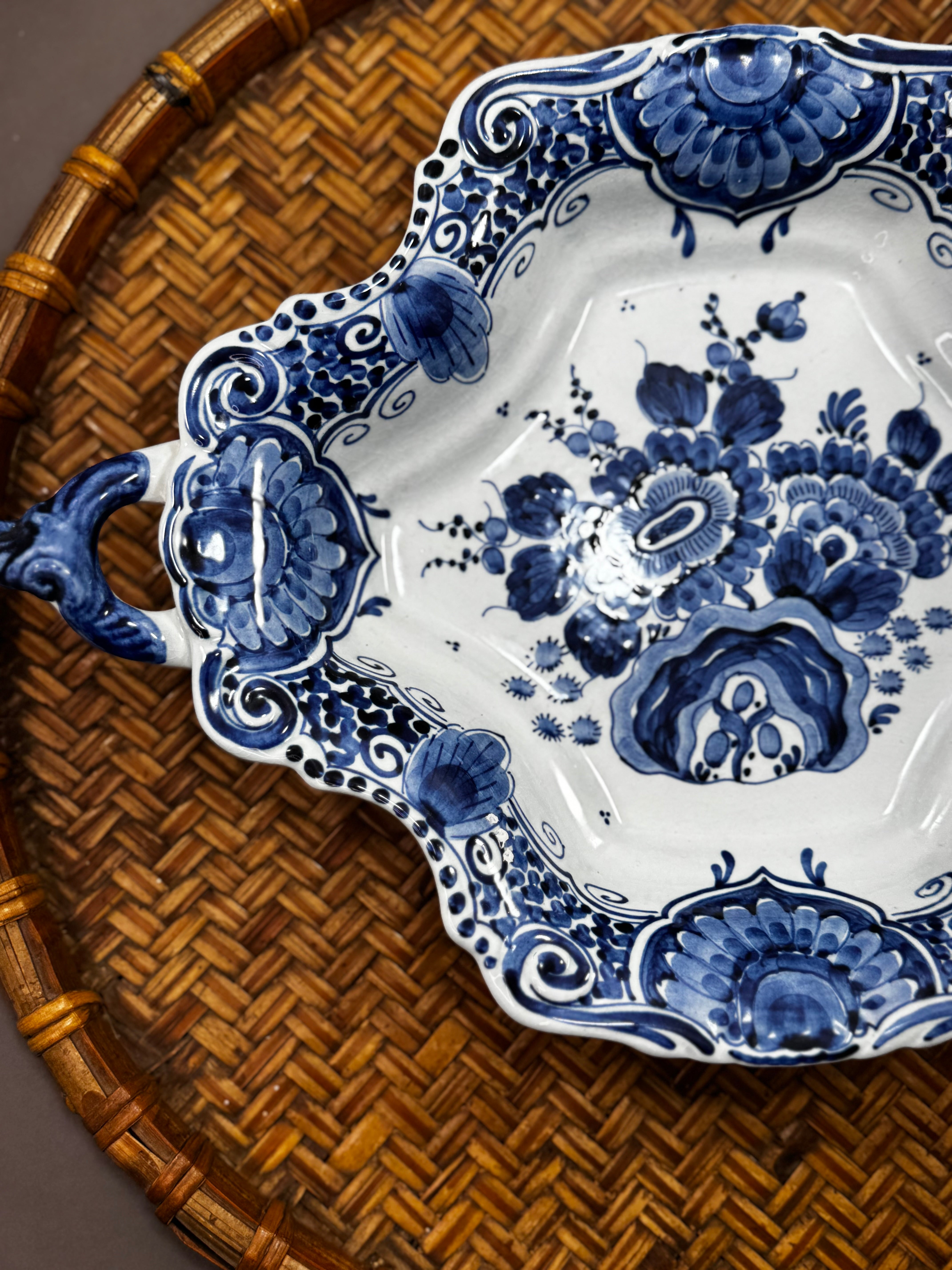 A beautiful piece of hand-painted blue floral Dutch Delftware. Unmarked, measuring 14” x 9.5” x 2” this decorative multi-sided dish with handles would be a a beautiful addition to any table. Good condition, has some crazing.