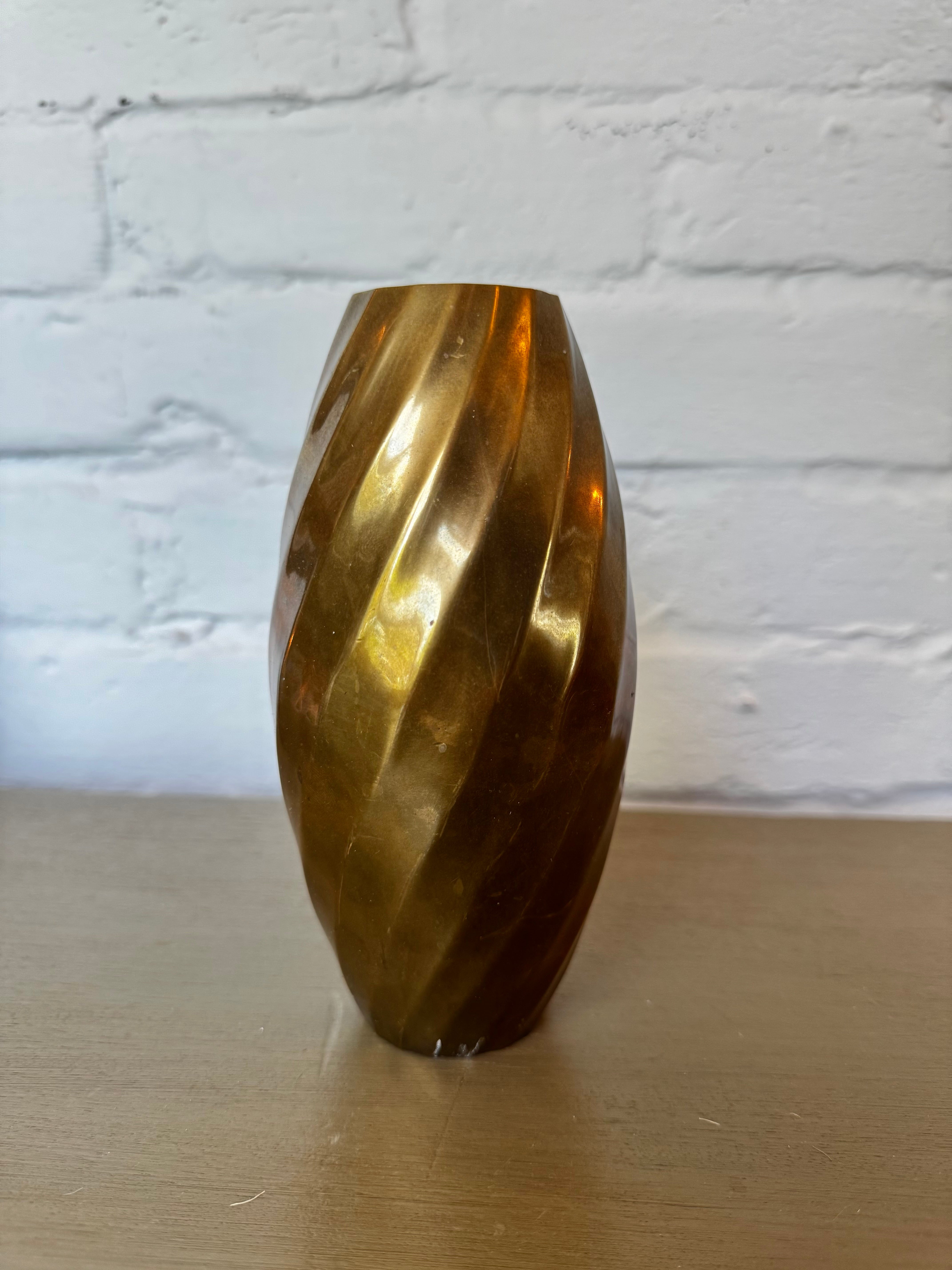 5.5” tall; Beautifully sculpted with a spiral twist design, this solid brass vase adds instant warmth and vintage charm. Unmarked but heavy and substantial in hand.