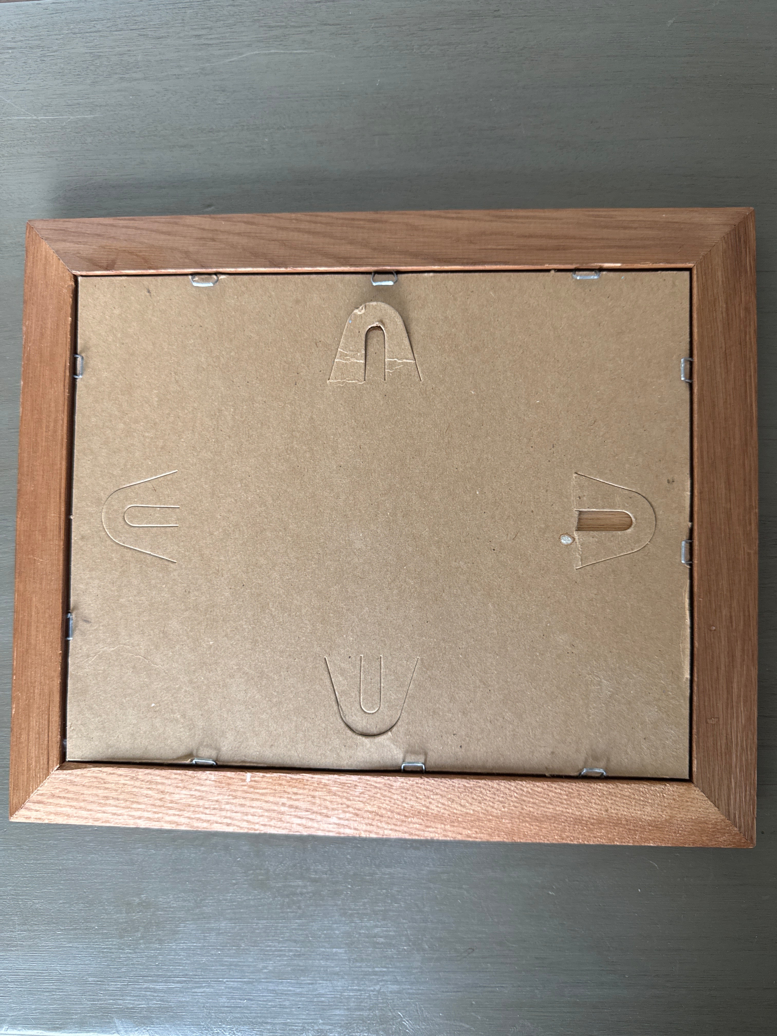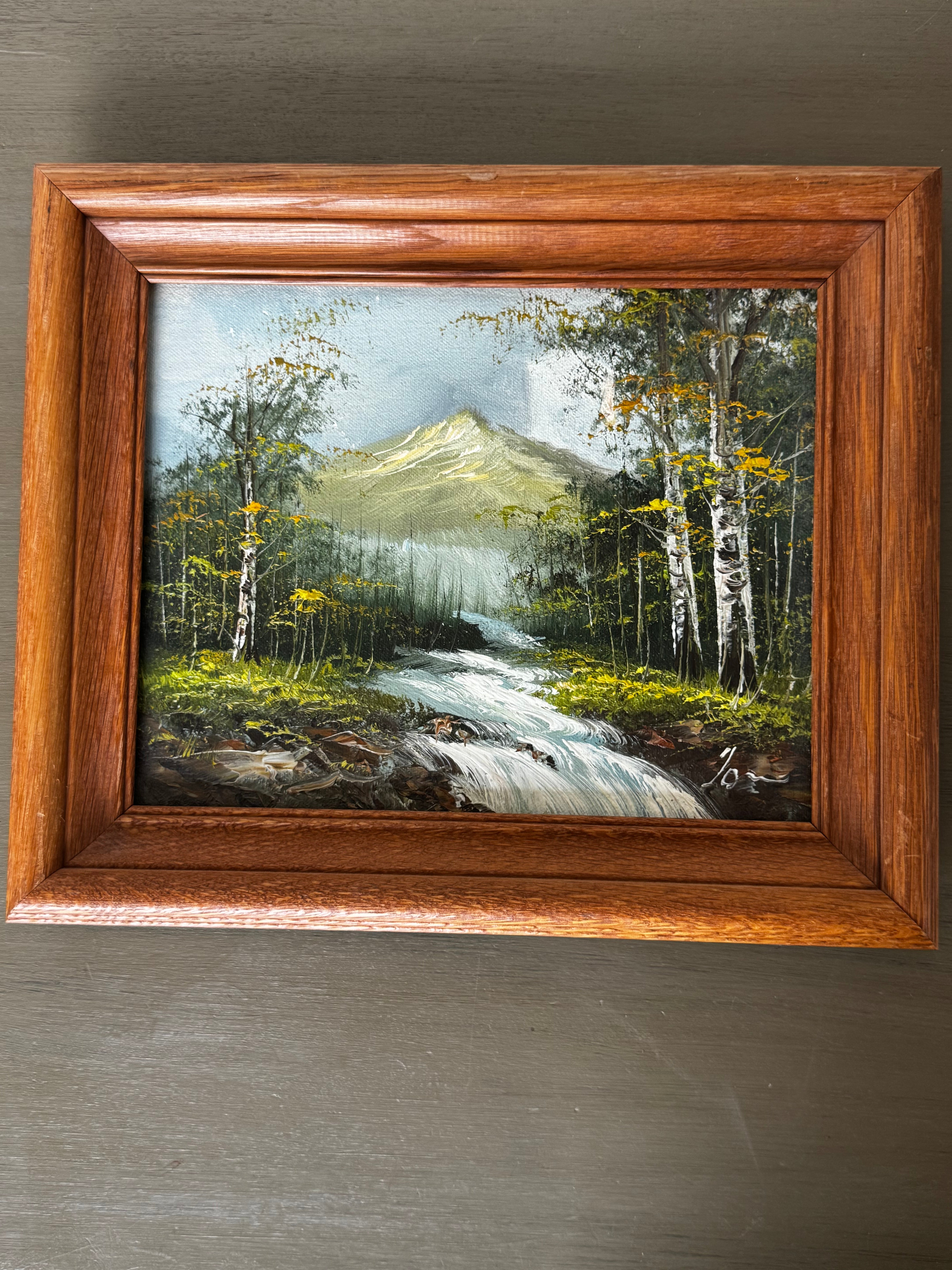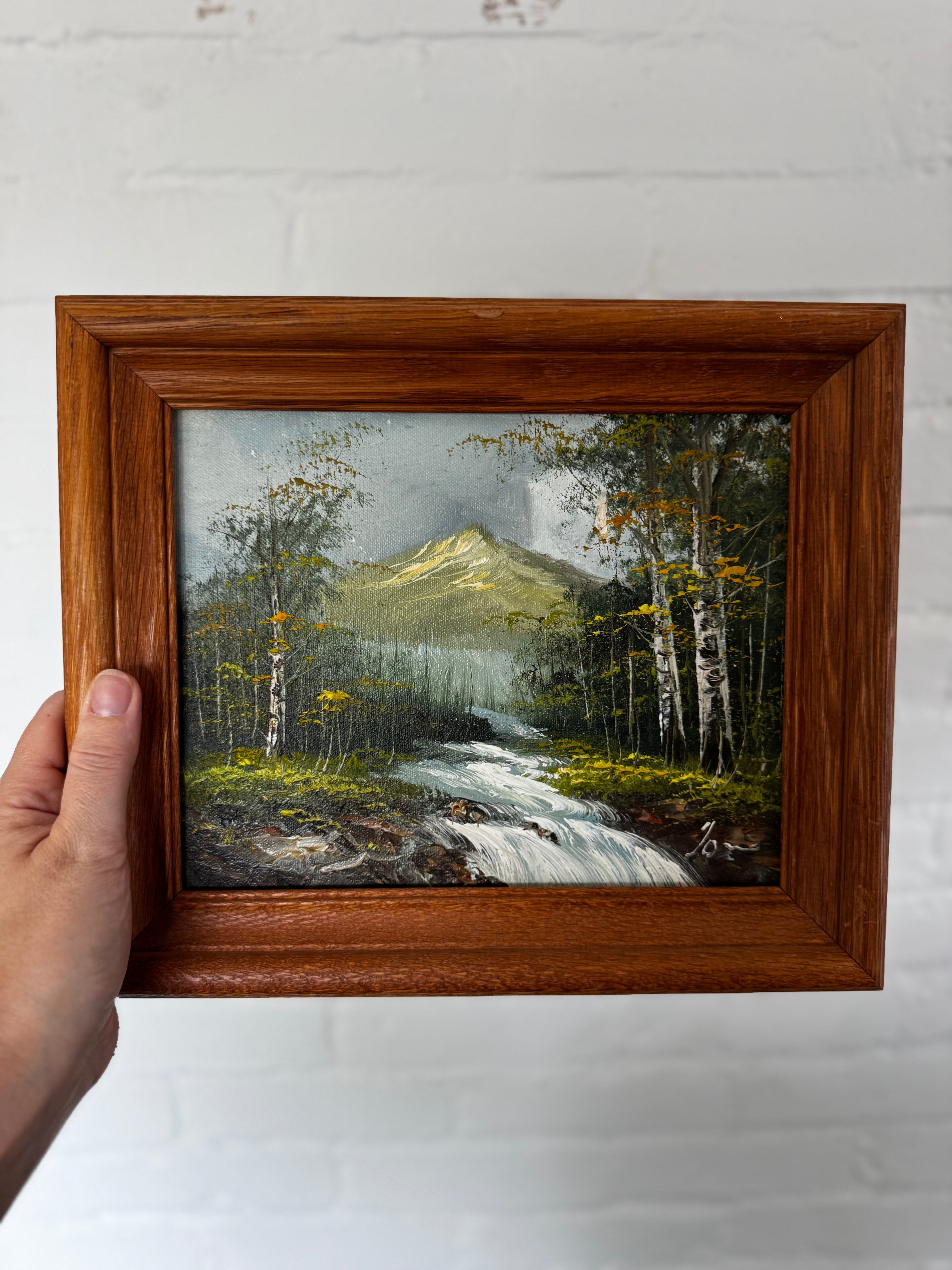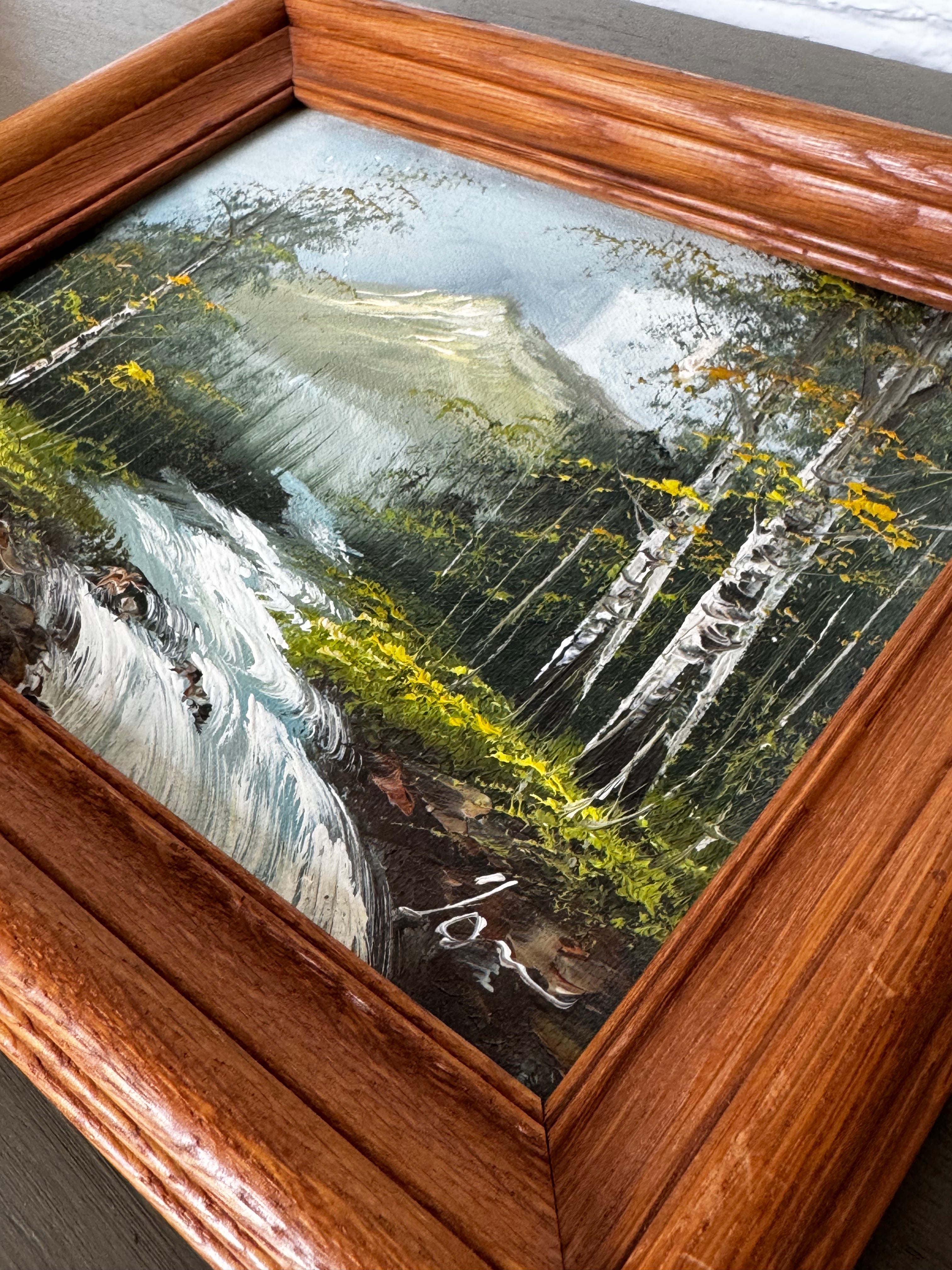 This small original oil painting features a vivid mountain landscape with a rushing stream, birch trees, and soft misty skies. The rich wood frame complements the natural color palette and gives it a cozy, rustic feel. Signed by the artist in the bottom right corner.