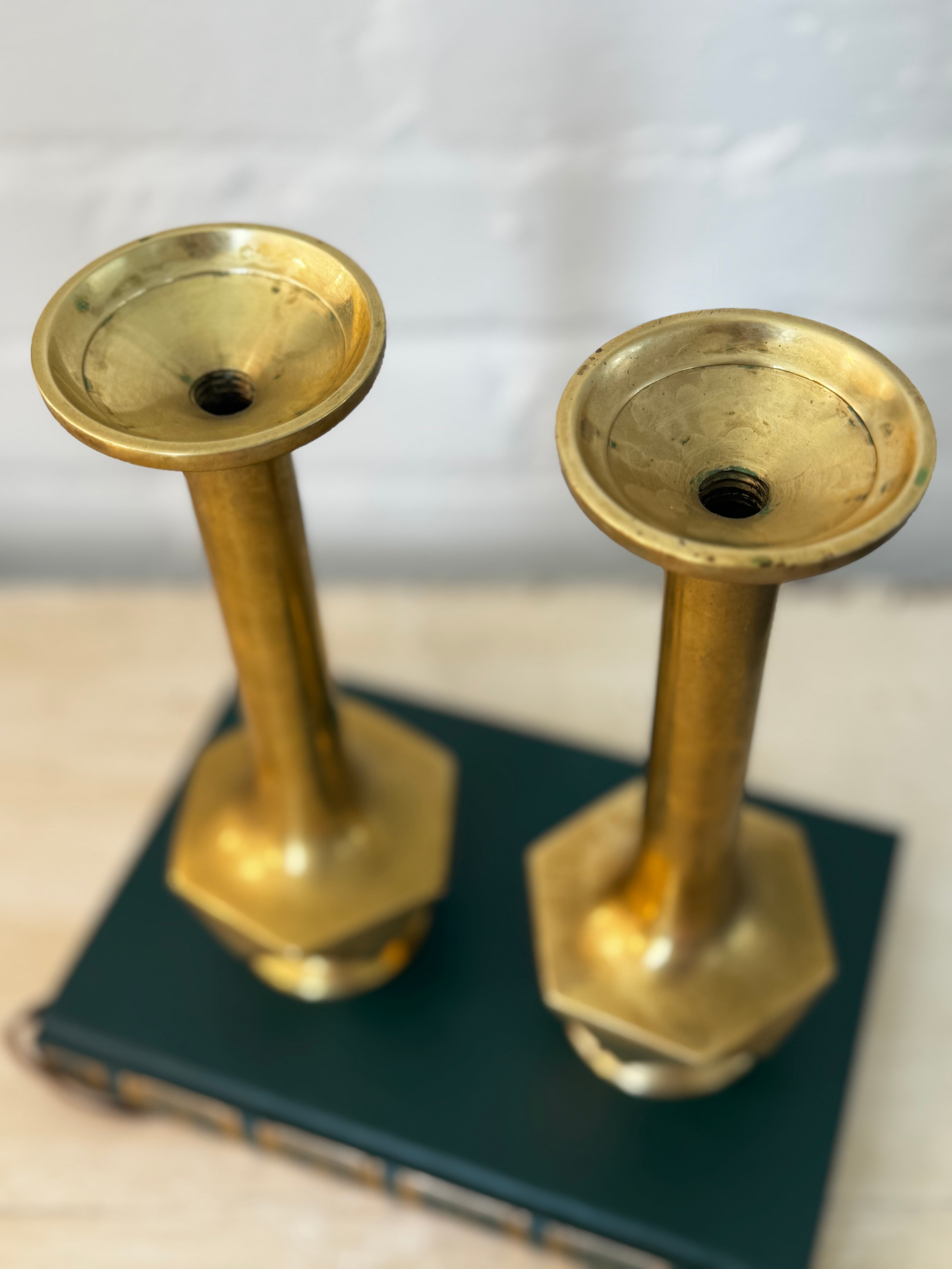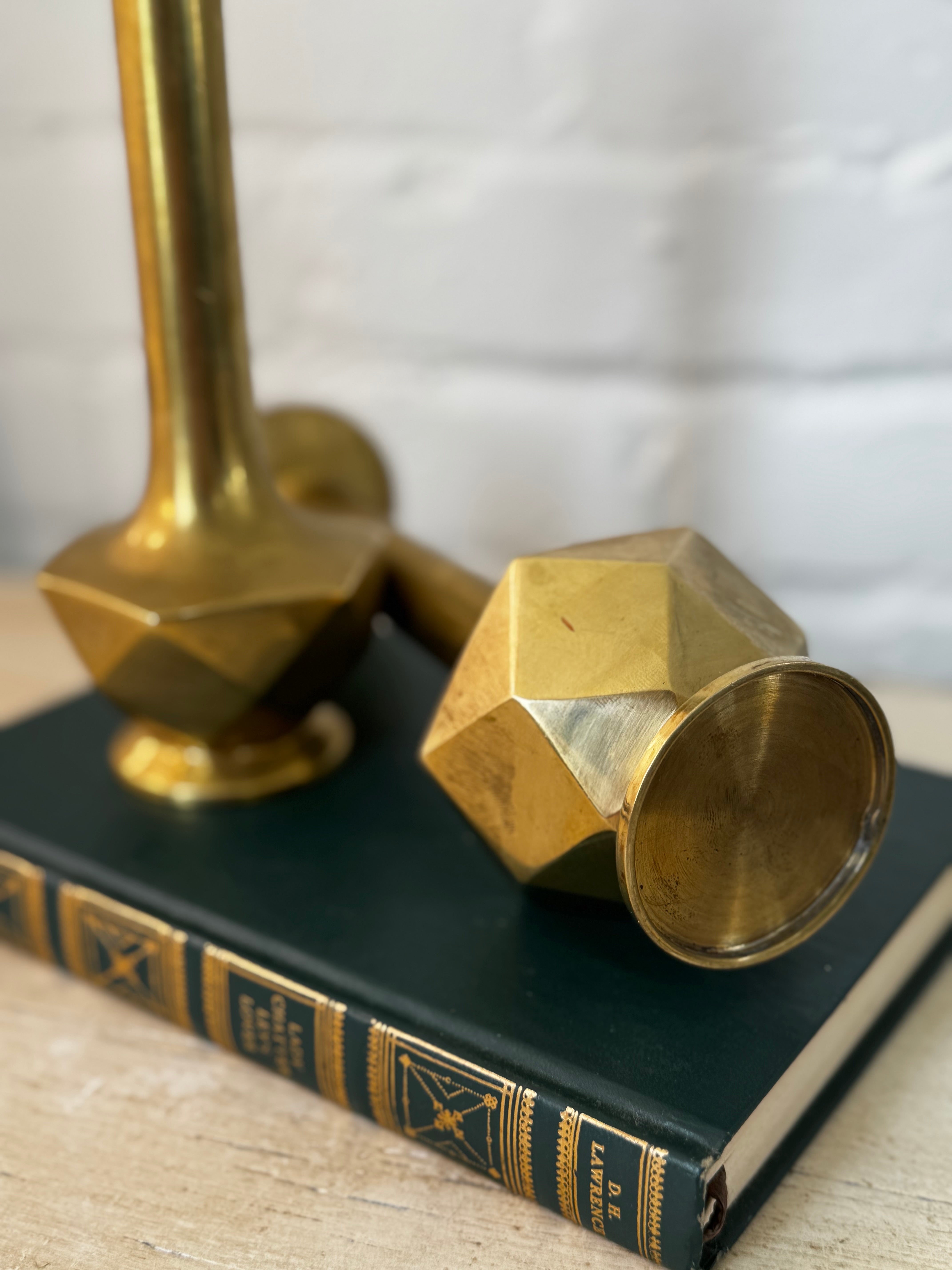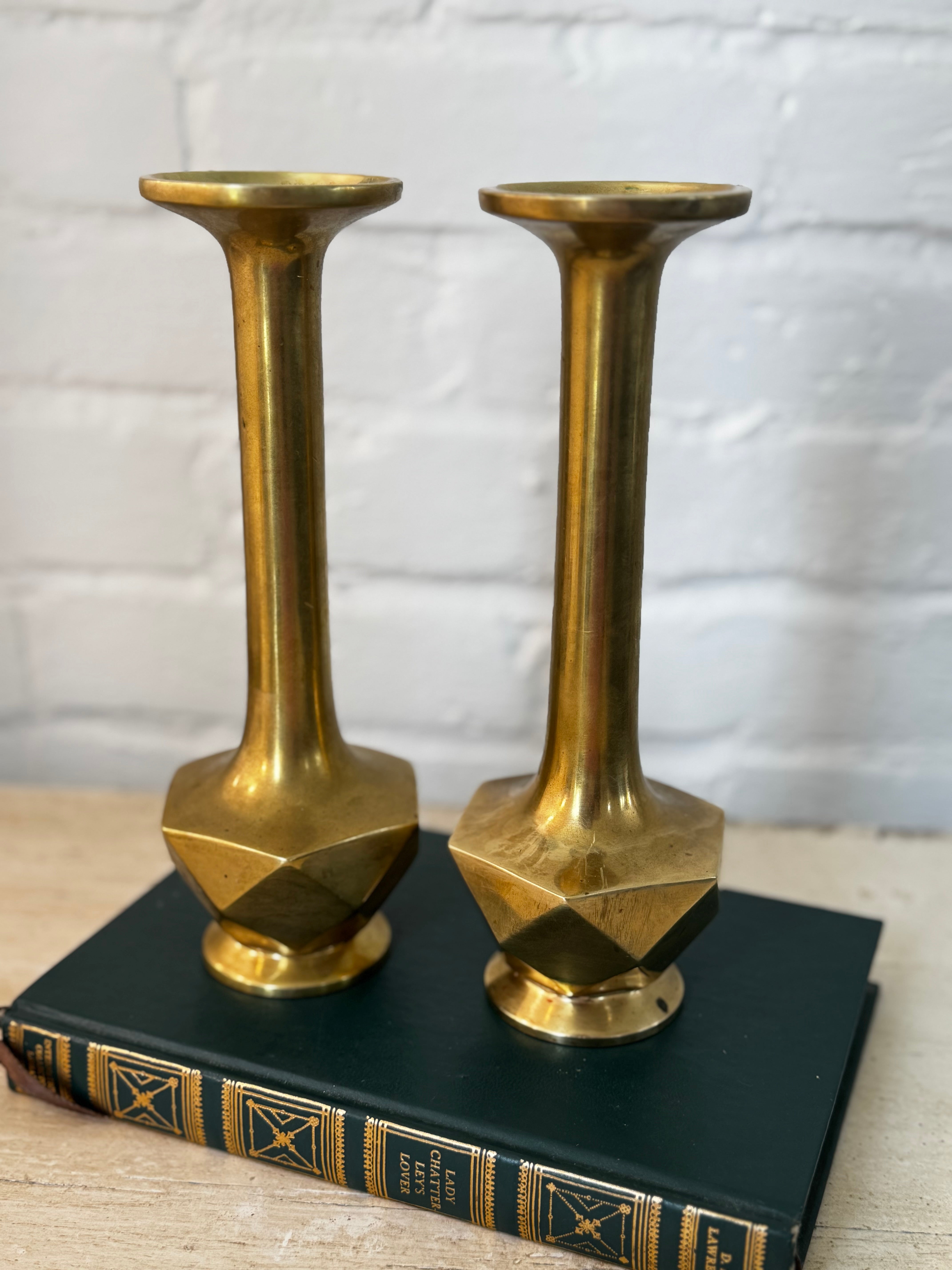 These striking brass pieces feature tall, flared stems and bold faceted bases, echoing the silhouette of classic candlesticks with a modernist twist. These decorative bases would hold a more wide based votive candle instead of a standard taper as the tops are hollow and threaded. However you use them, that timeless brass glow would be perfect for styling a shelf or layered into a moody vignette.