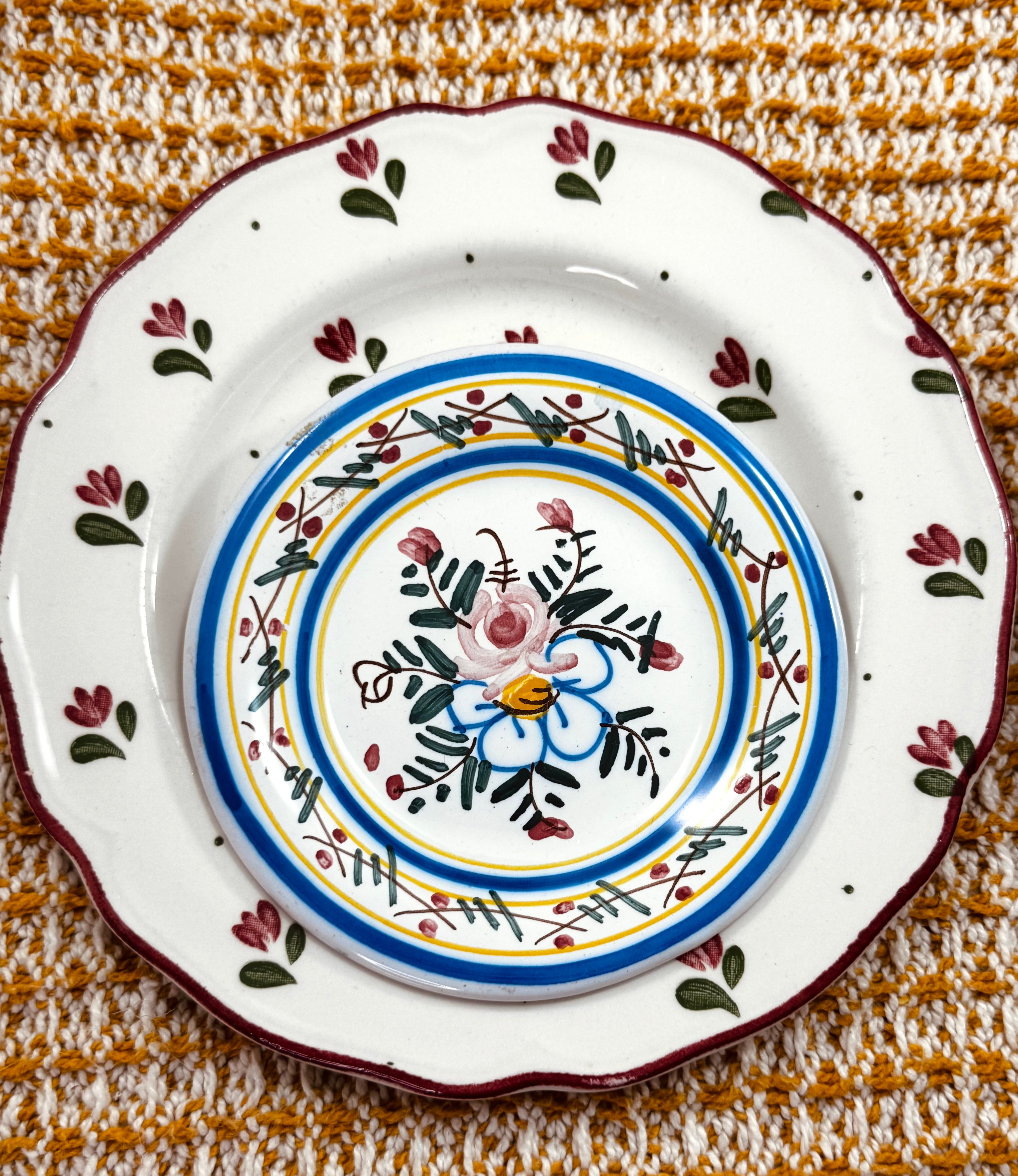 A sweet, hand-painted ceramic dessert plate featuring a delicate floral motif with soft blues, pinks, and green detailing. Perfectly sized for a bread plate, trinket dish, or layered into a cozy kitchen display. A charming little piece that brings a touch of old-world warmth and color to everyday moments