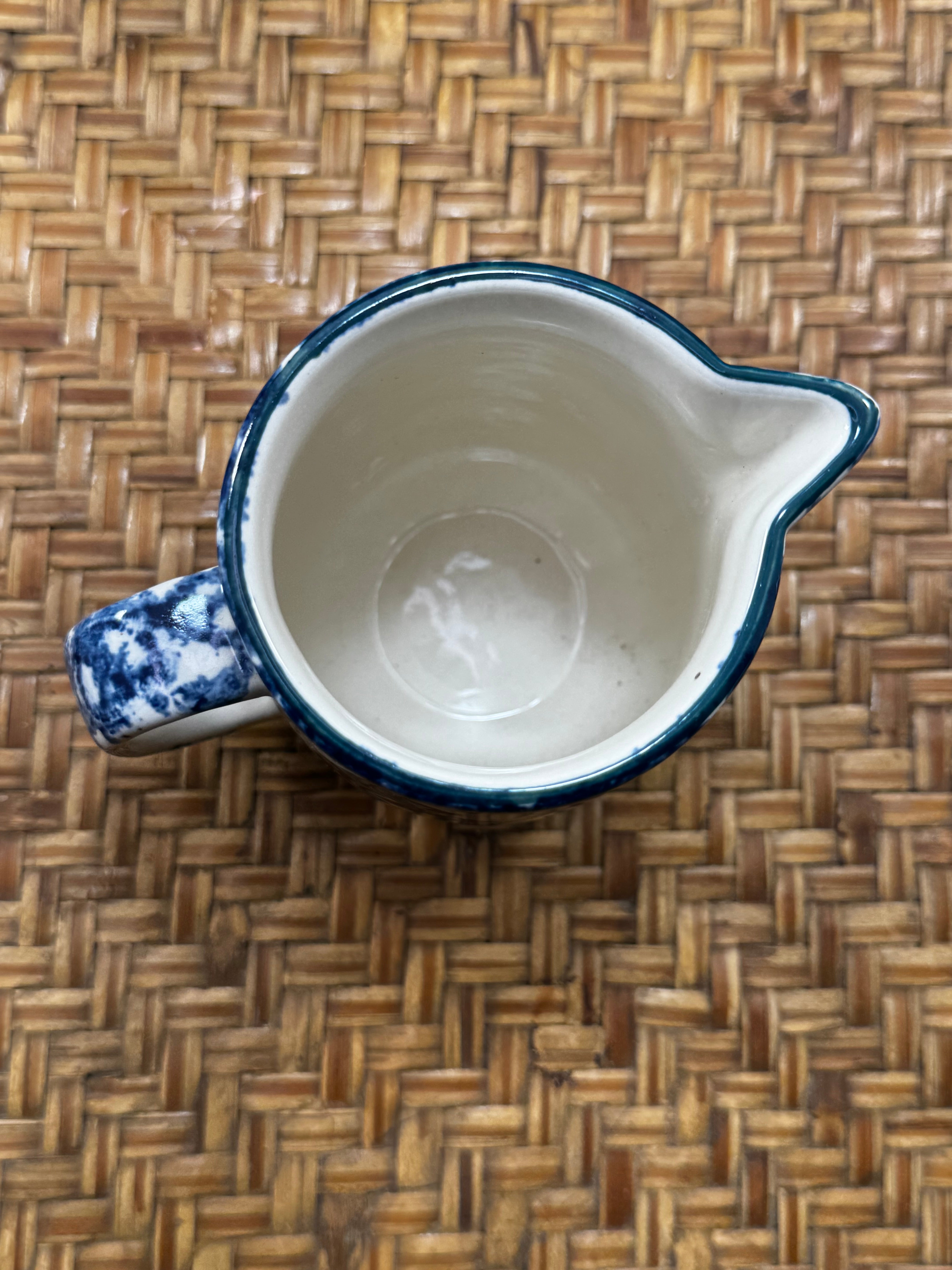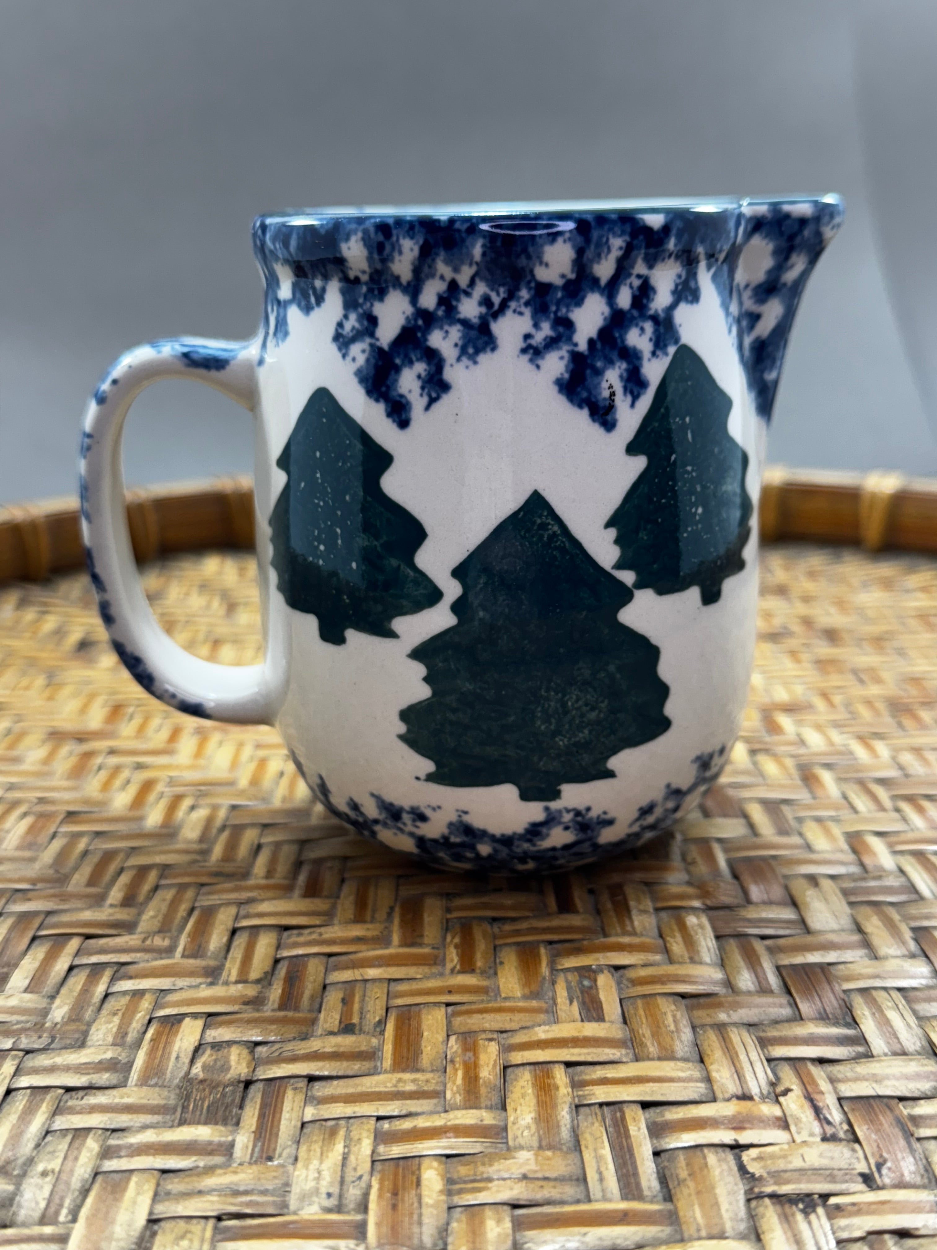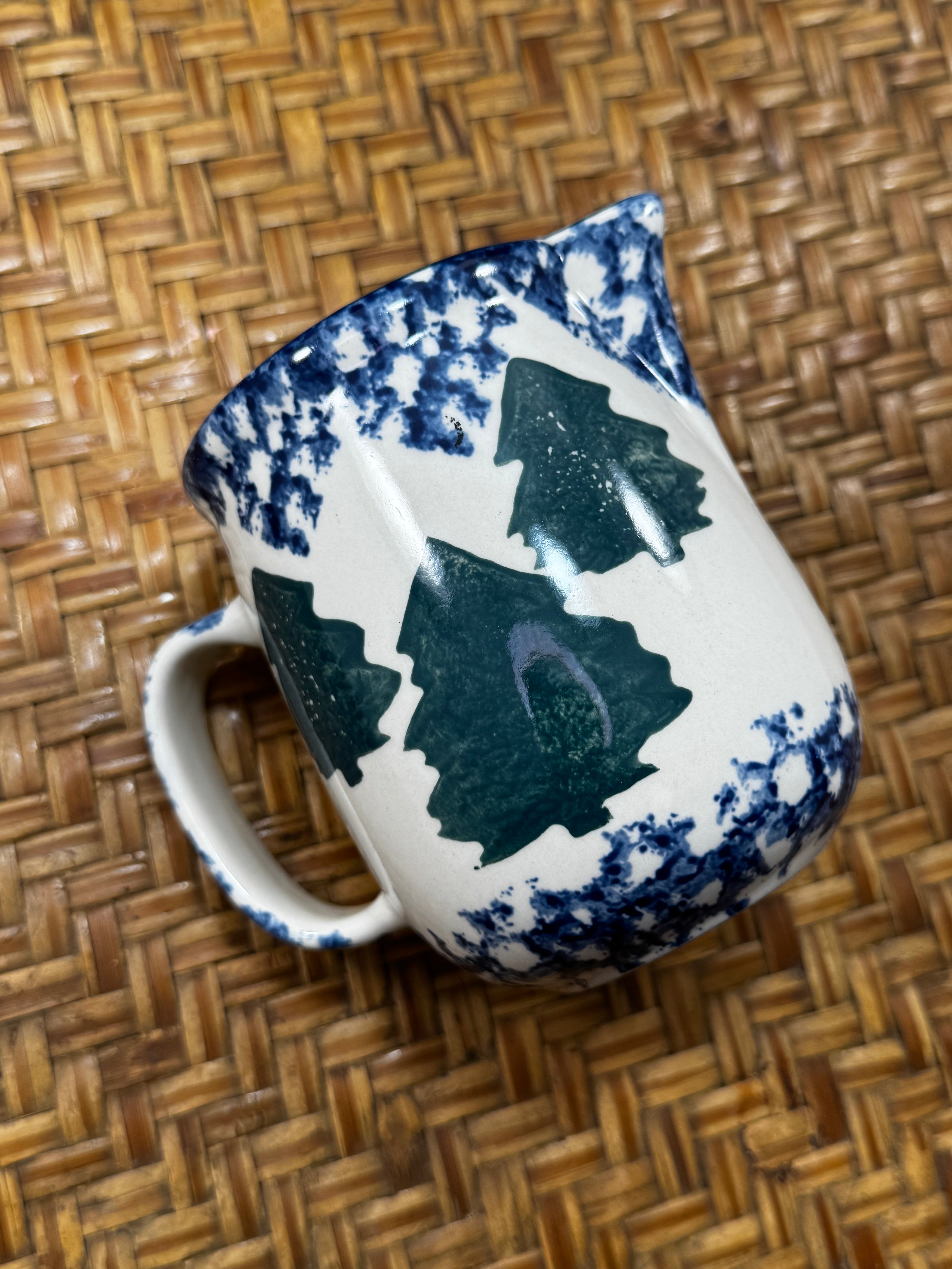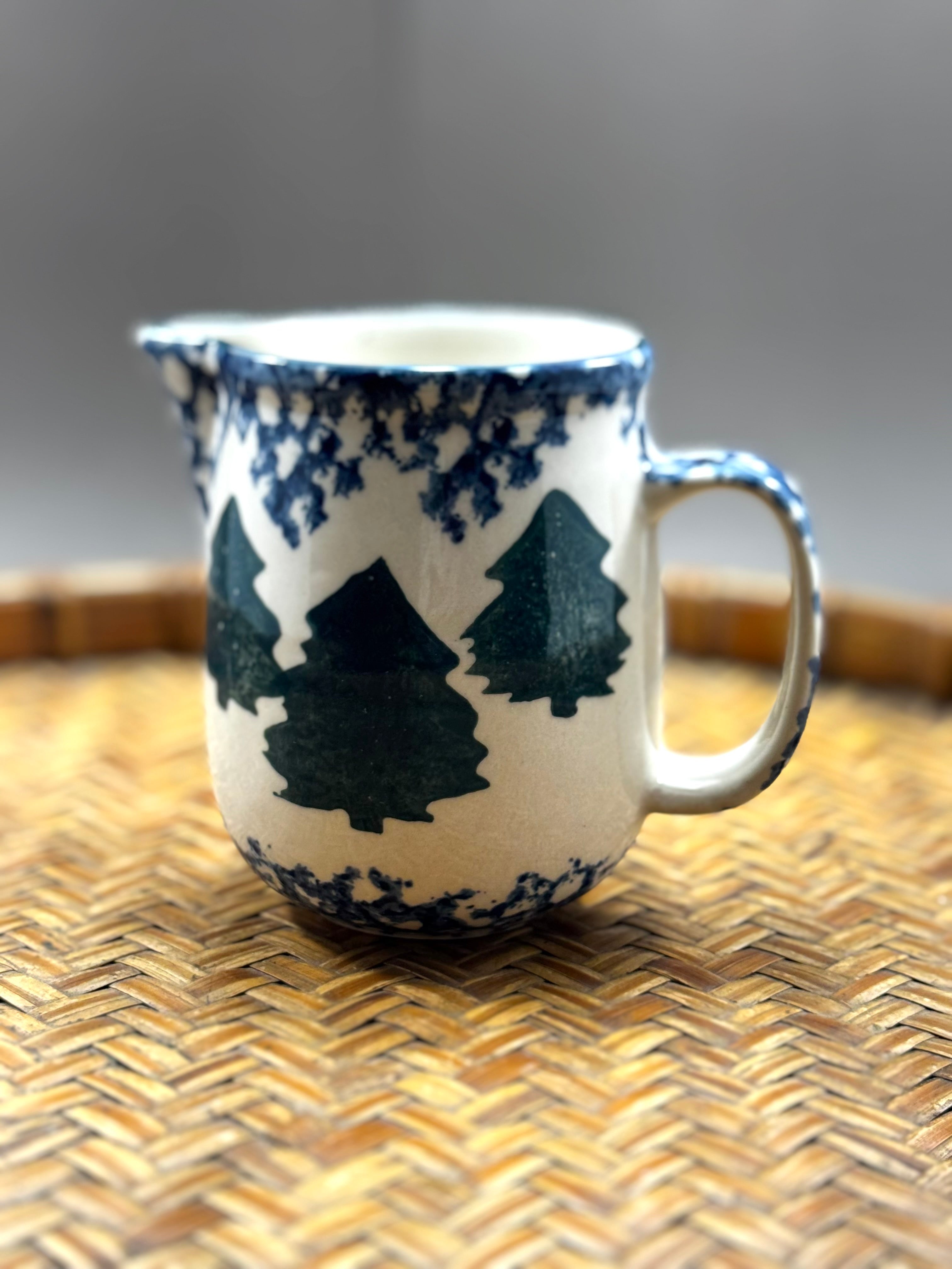 This sweet little nostalgic stoneware piece is part of a discontinued dinnerware collection. Standing 4” tall, this whimsy, folk-art cute creamer pitcher feature a white base with blue spongeware accents and a green Christmas tree motif.