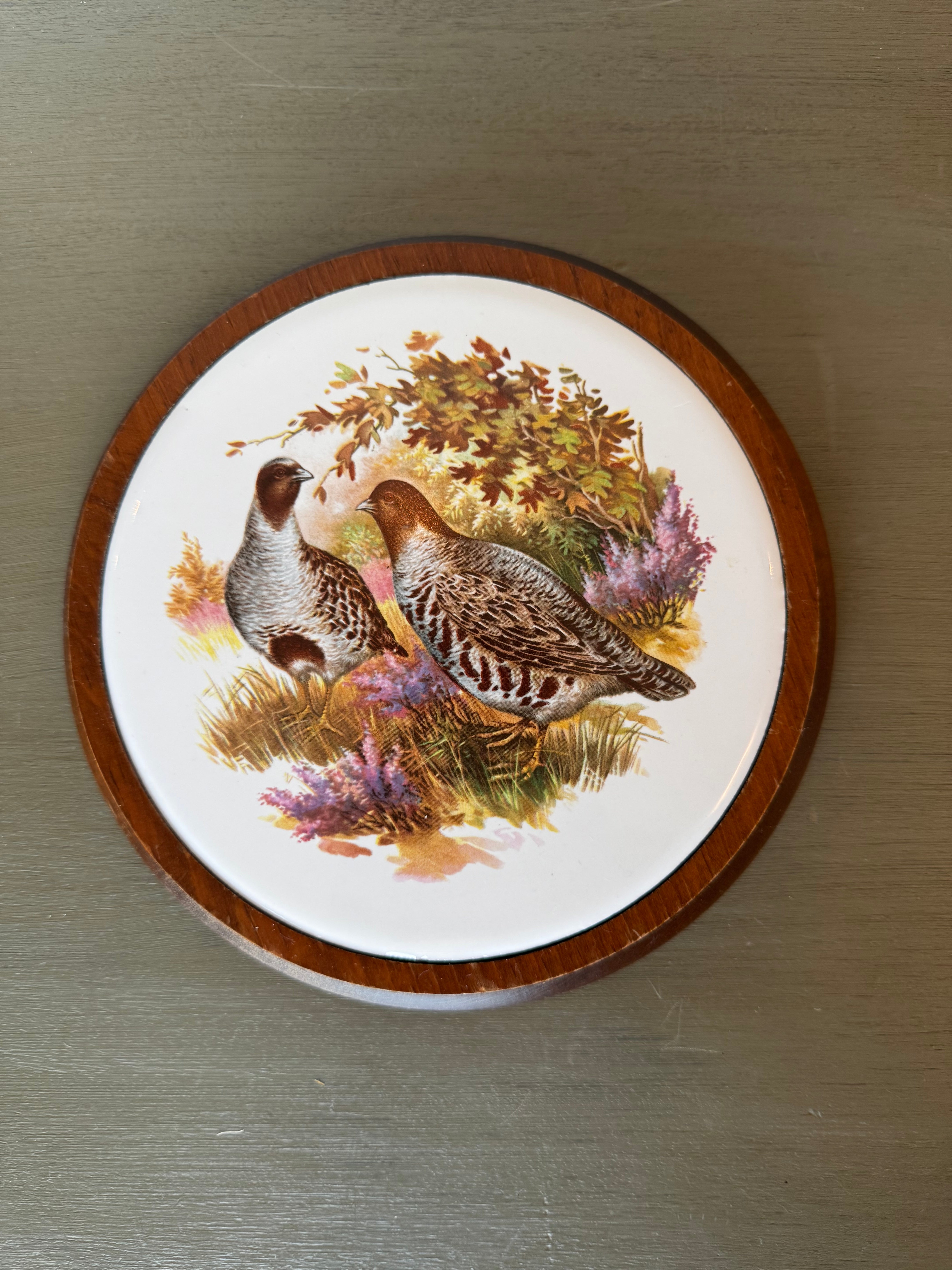 A charming vintage wall plate featuring a pair of game birds against a woodland backdrop. The detailed ceramic center is framed in warm wood, making it a beautiful accent for a cozy home, cottage, or cabin.