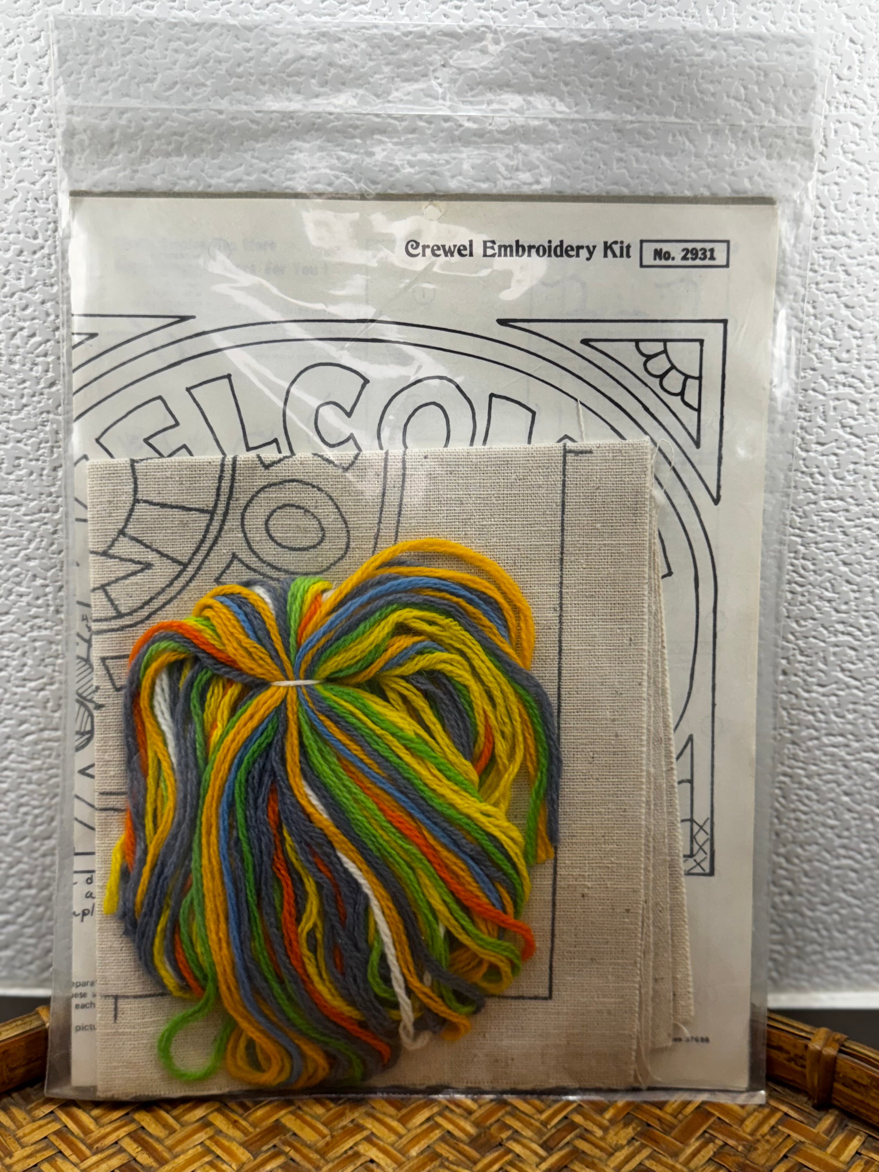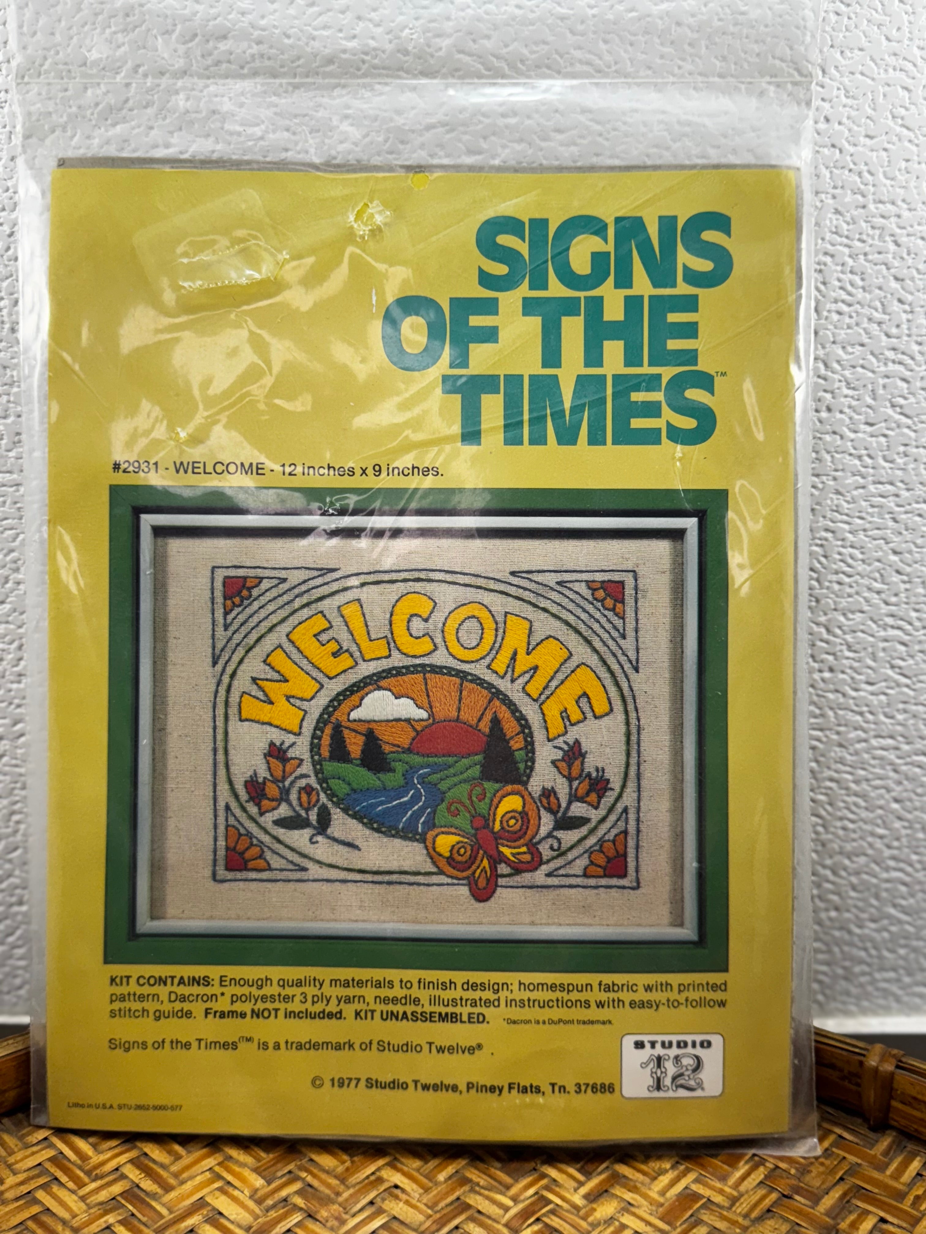 A little burst of ’70s charm waiting to be stitched! This unassembled kit includes everything you need to create a warm, groovy “WELCOME” scene—sunset, trees, butterfly and all. Finished size is 12” x 9”. Package is unopened and in good vintage condition (there is a hole in the plastic on the front). A perfect cozy craft for retro lovers and home-makers of whimsy.