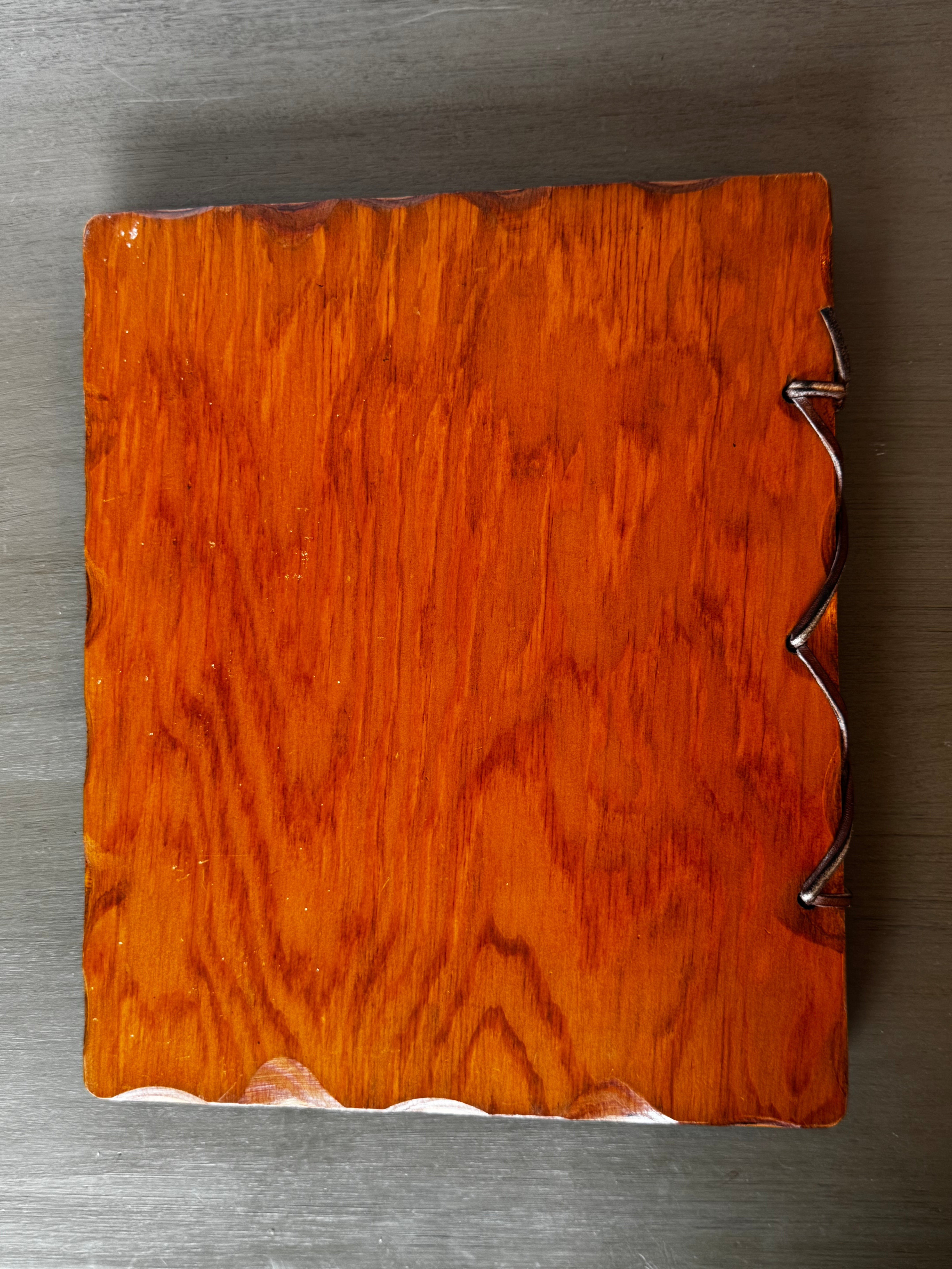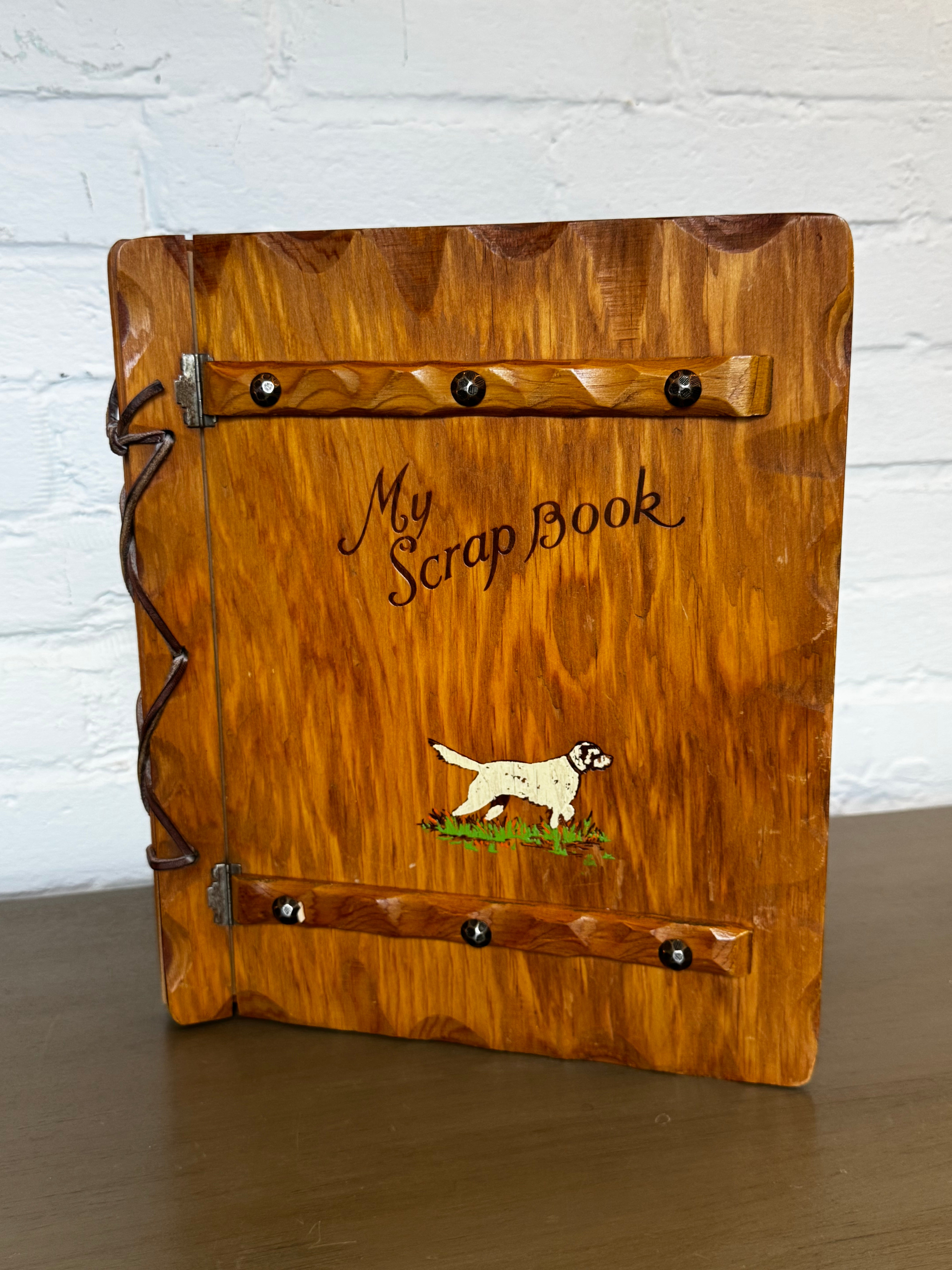 This hand-bound wooden scrapbook is full of rustic charm, featuring a white hunting dog hand-painted on the cover and bound with leather cording. Inside are thick brown paper pages ready for memories, art, or journaling. Measures 10” x 12”, great condition, used paper inside has been ripped out.