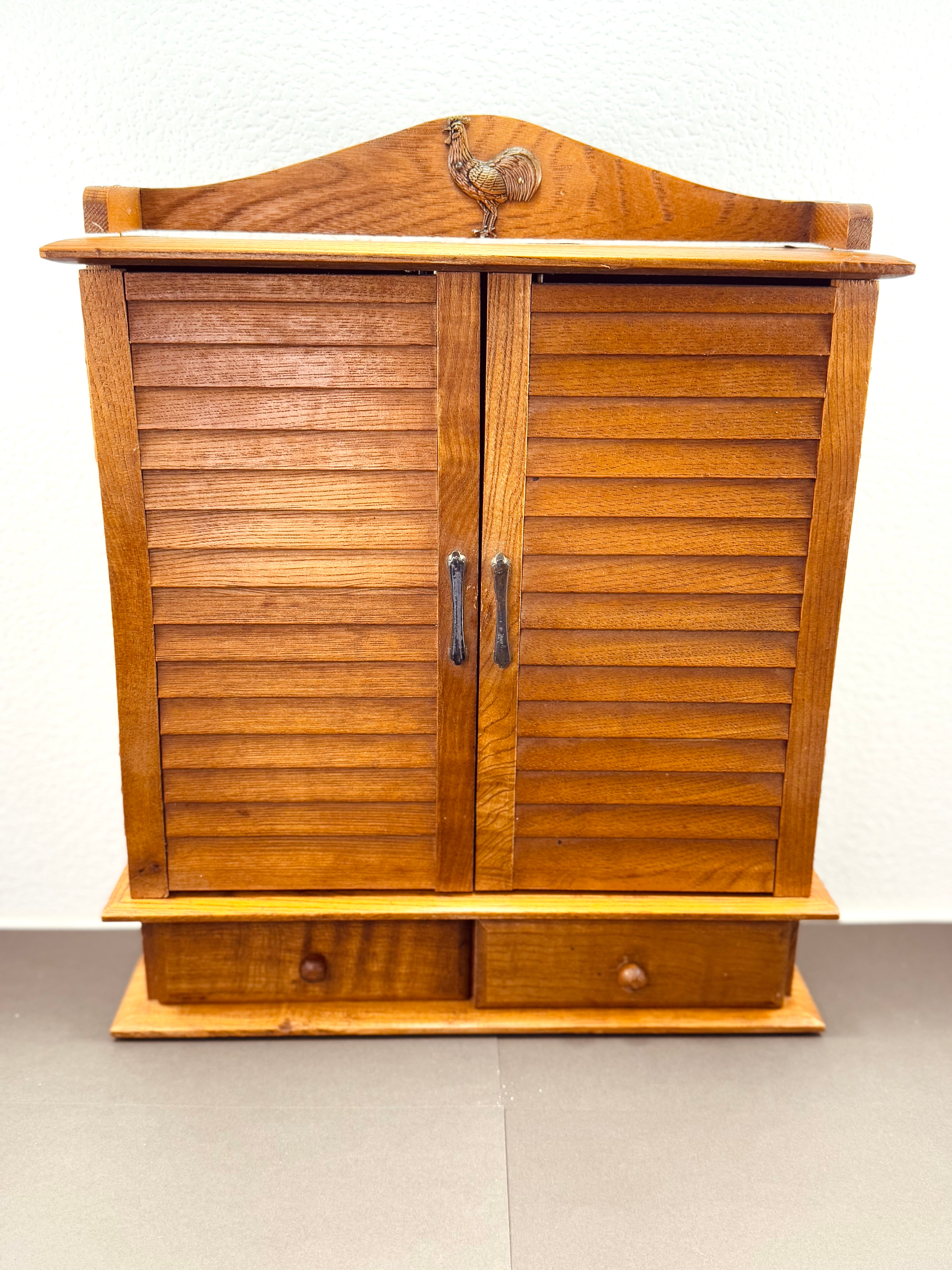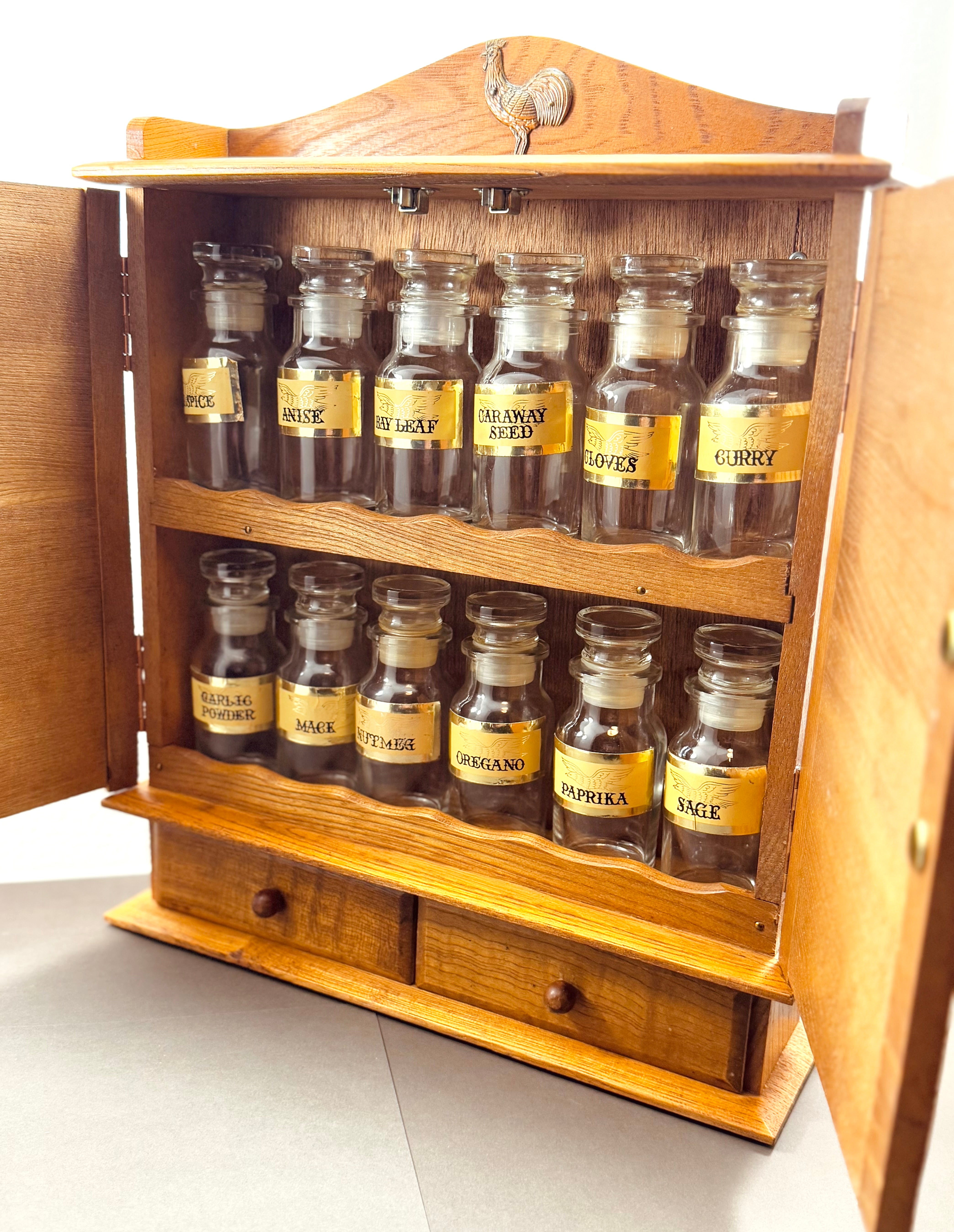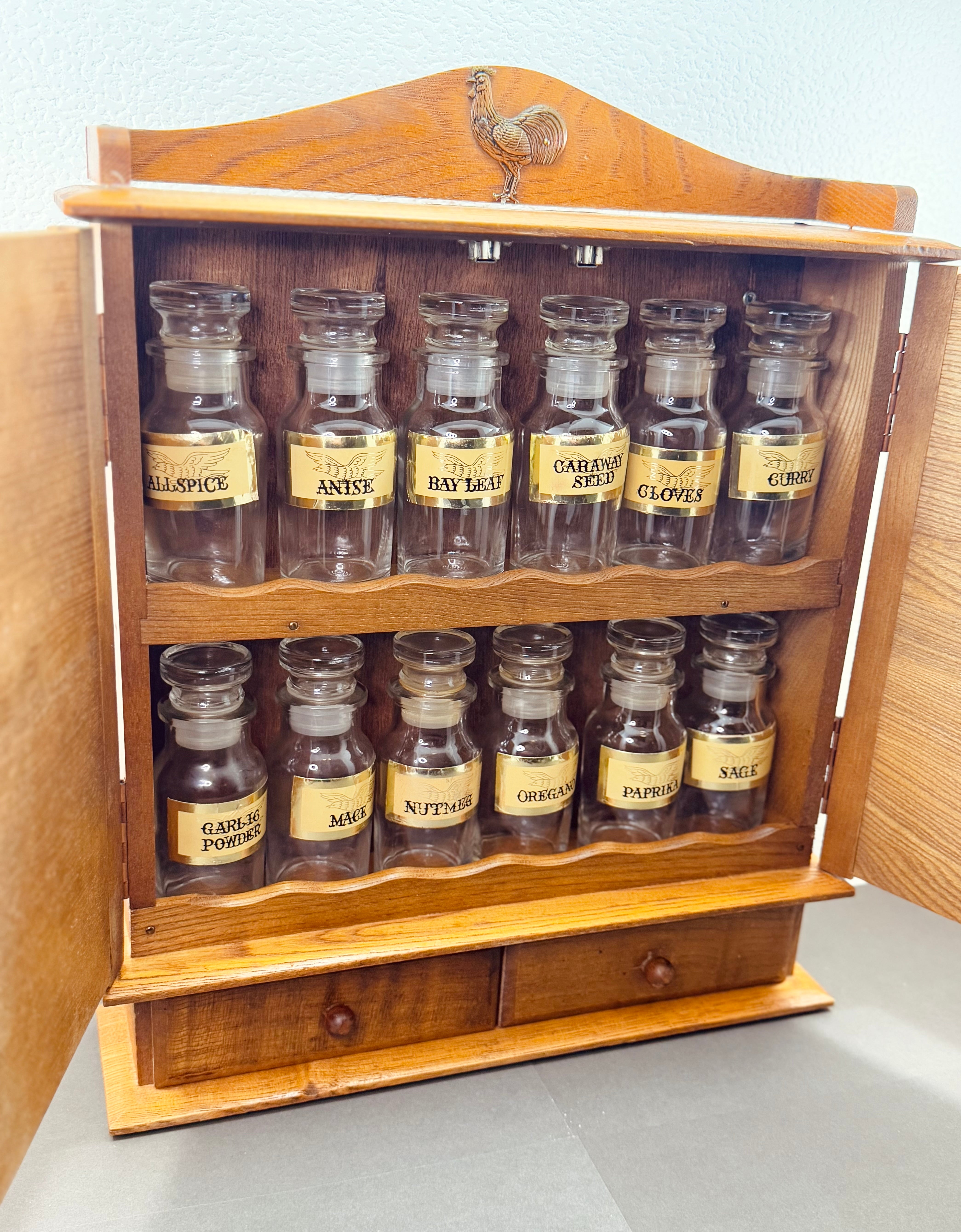 A sweet little farmhouse spice cabinet with all the vintage charm. Lightweight wood with slatted double doors, two tiny drawers, and a proud metal rooster perched on top. Inside are two shelves that hold the included set of twelve glass spice labeled bottles (each marked “Made in Japan”).