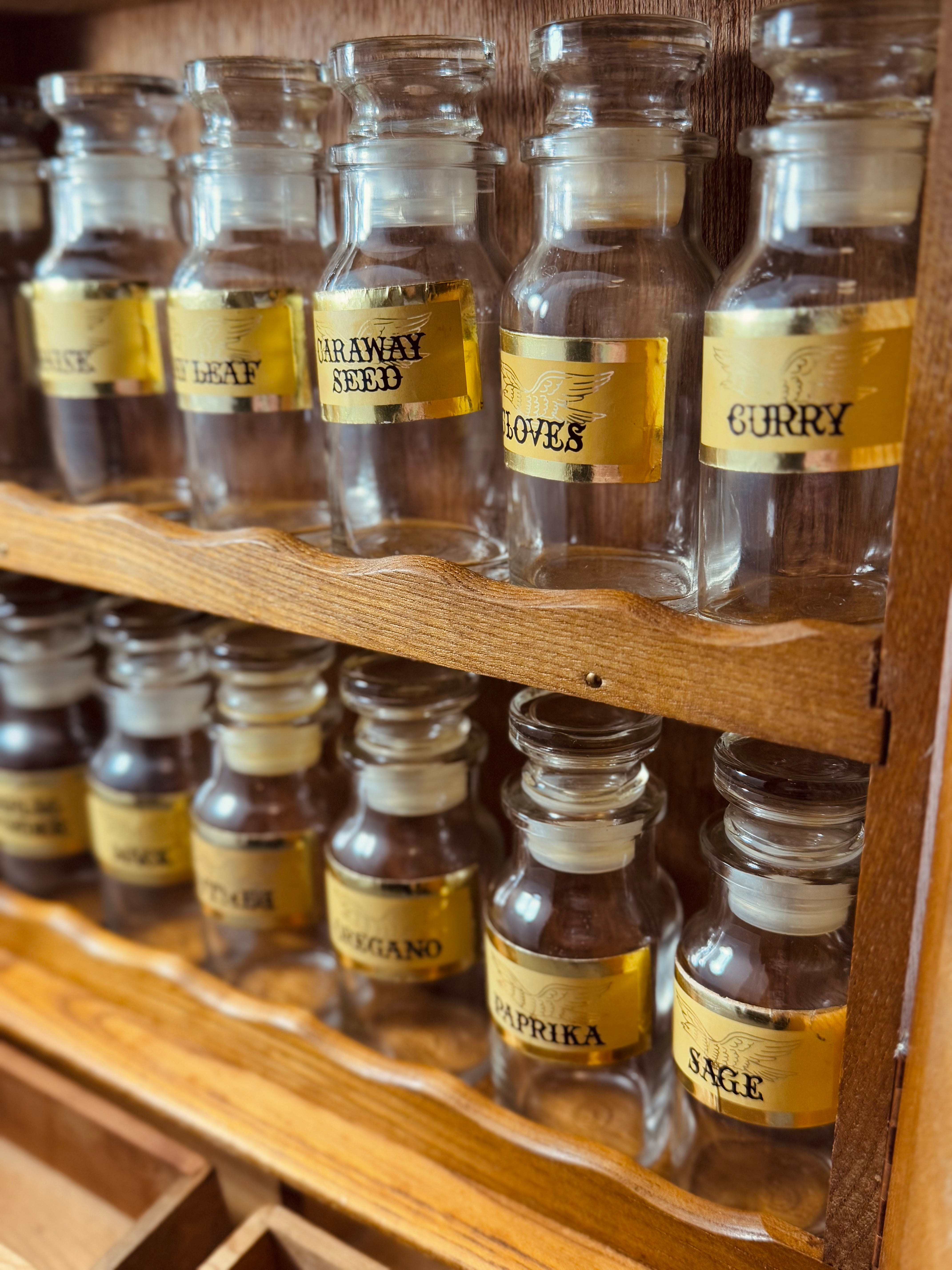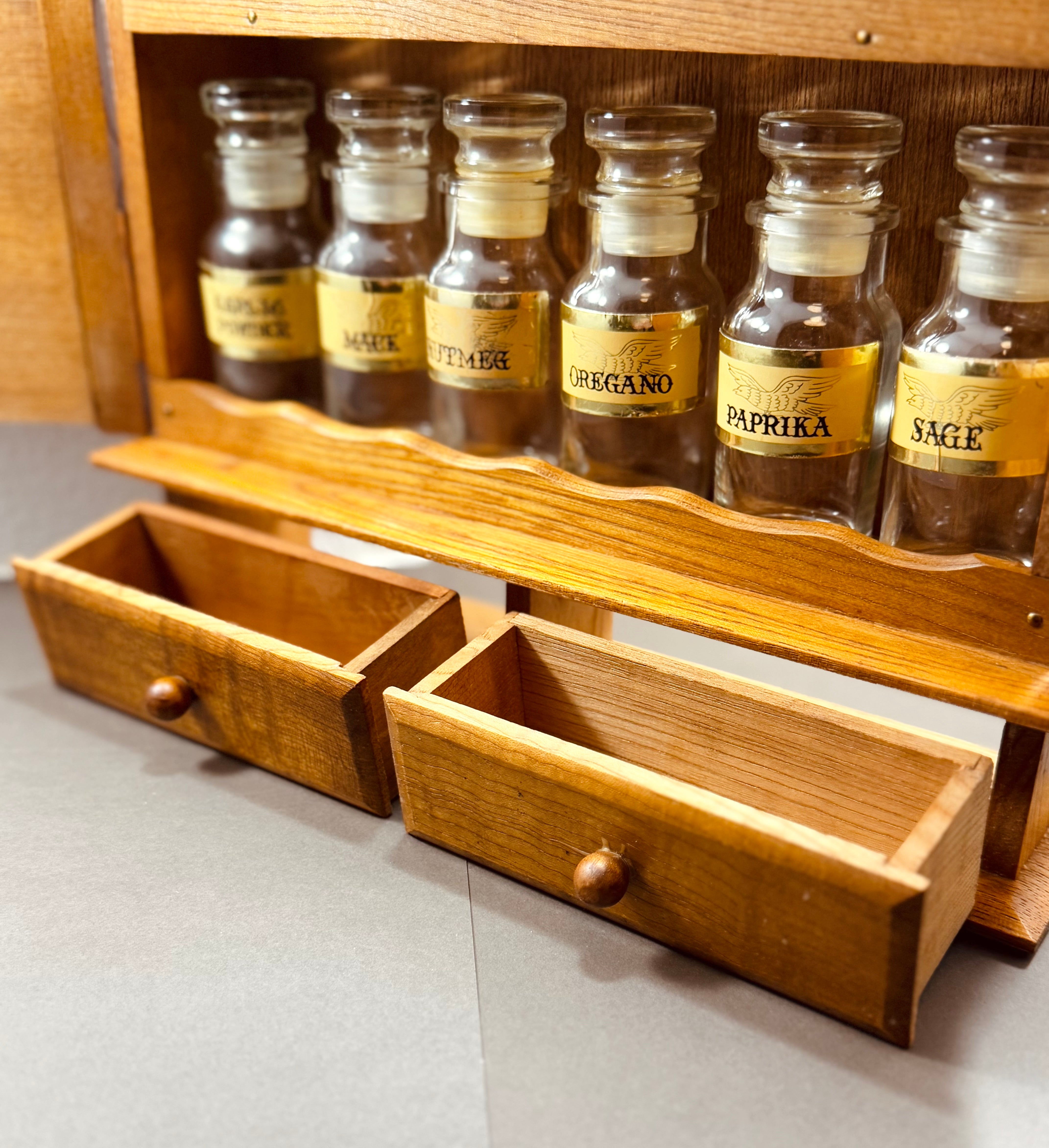Vintage Wooden Spice Cabinet with 12 Glass Bottles