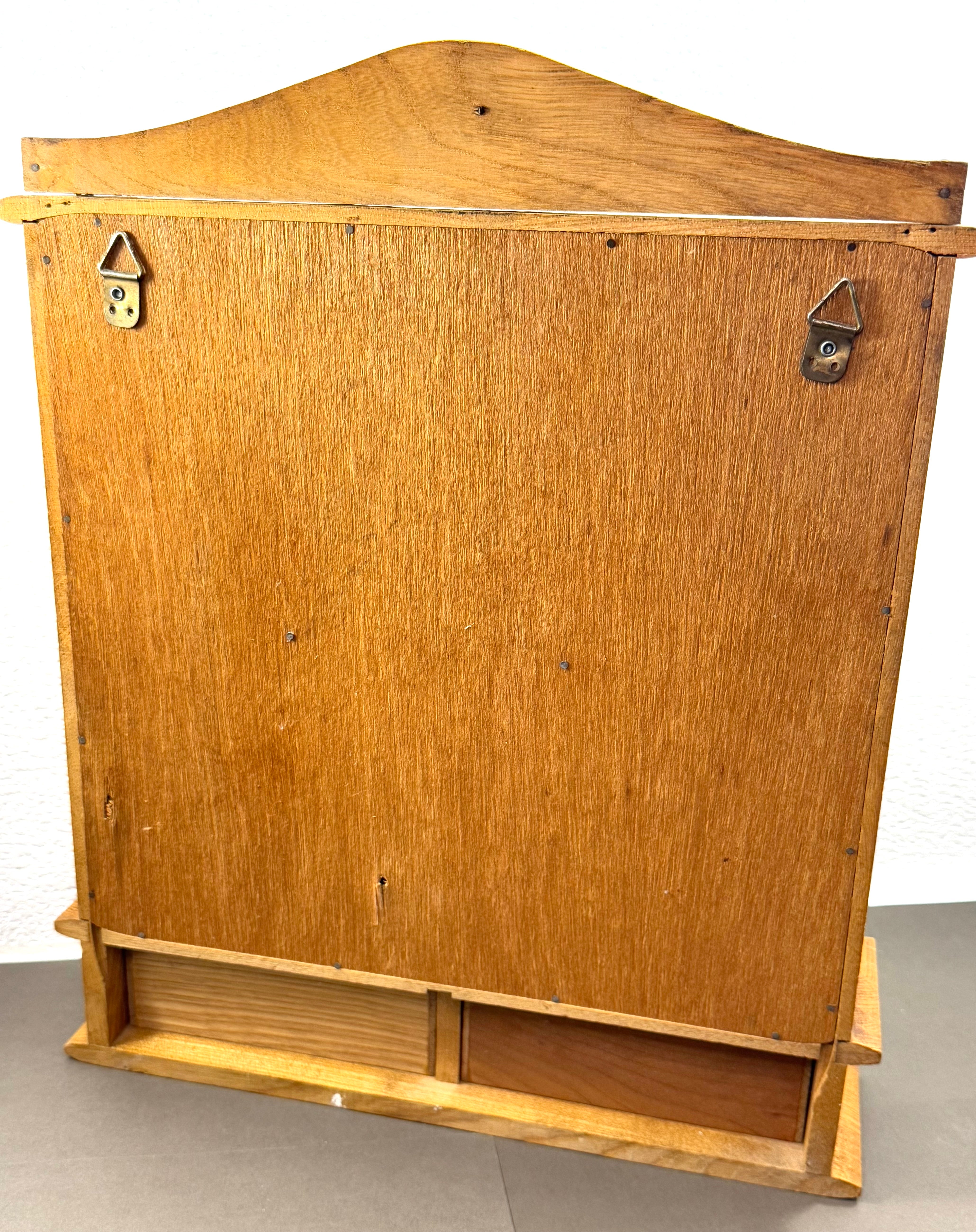 This piece can sit on your countertop or hang on the wall using the attached triangular hangers. It’s in great condition, no scratches or nicks in the wood. The bottles and their labels are also in good condition, none which are cracked or chipped. They’ve been washed and are ready for use!